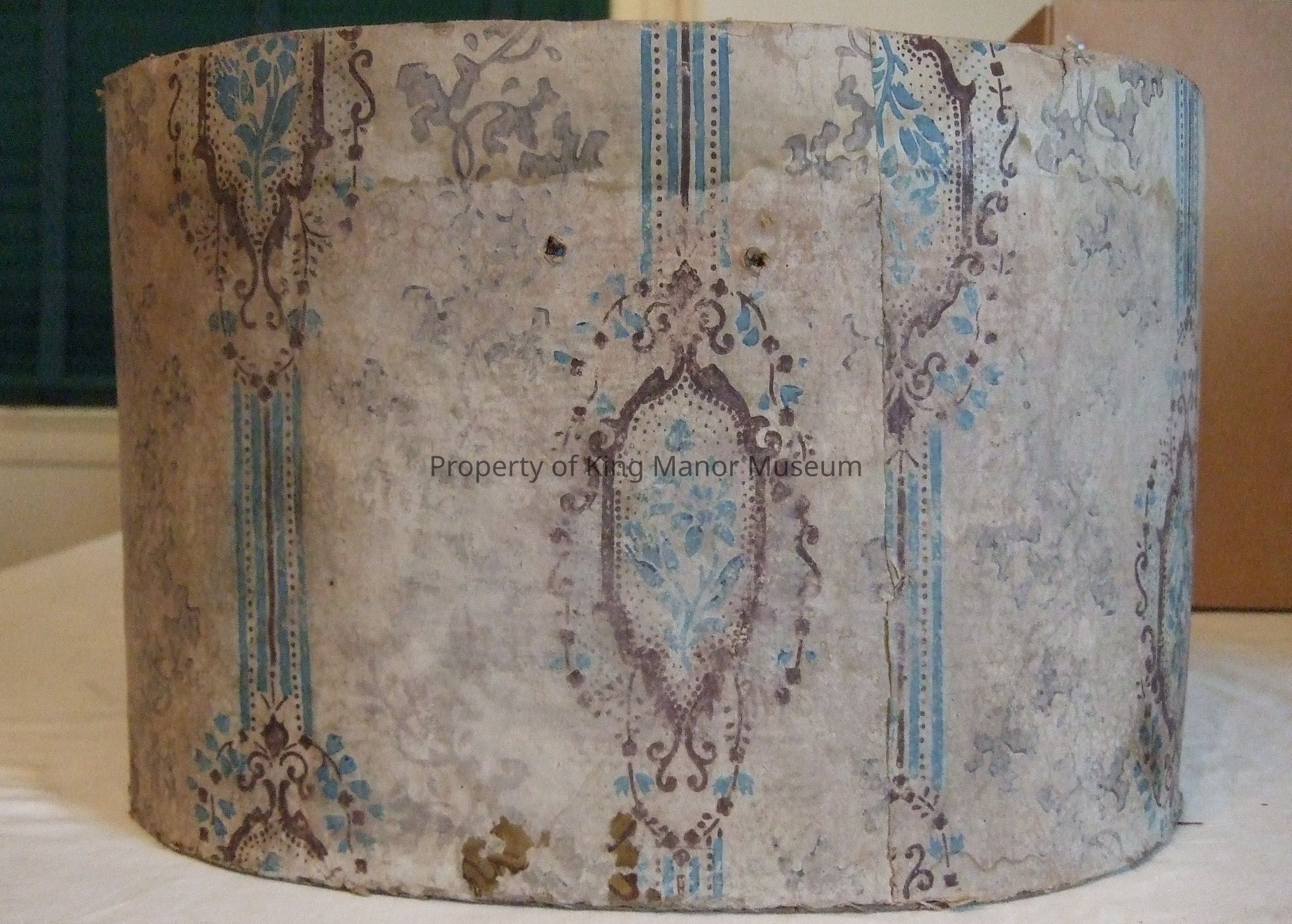 Cardboard bandbox of oval shape having paper covered exterior featuring a print of repeat turquoise and brown stripe and alternating elongated floral medallion of same colors, a grey ivy fills between stripes; the interior is lined with turquoise paper; this box once had a coverCollection