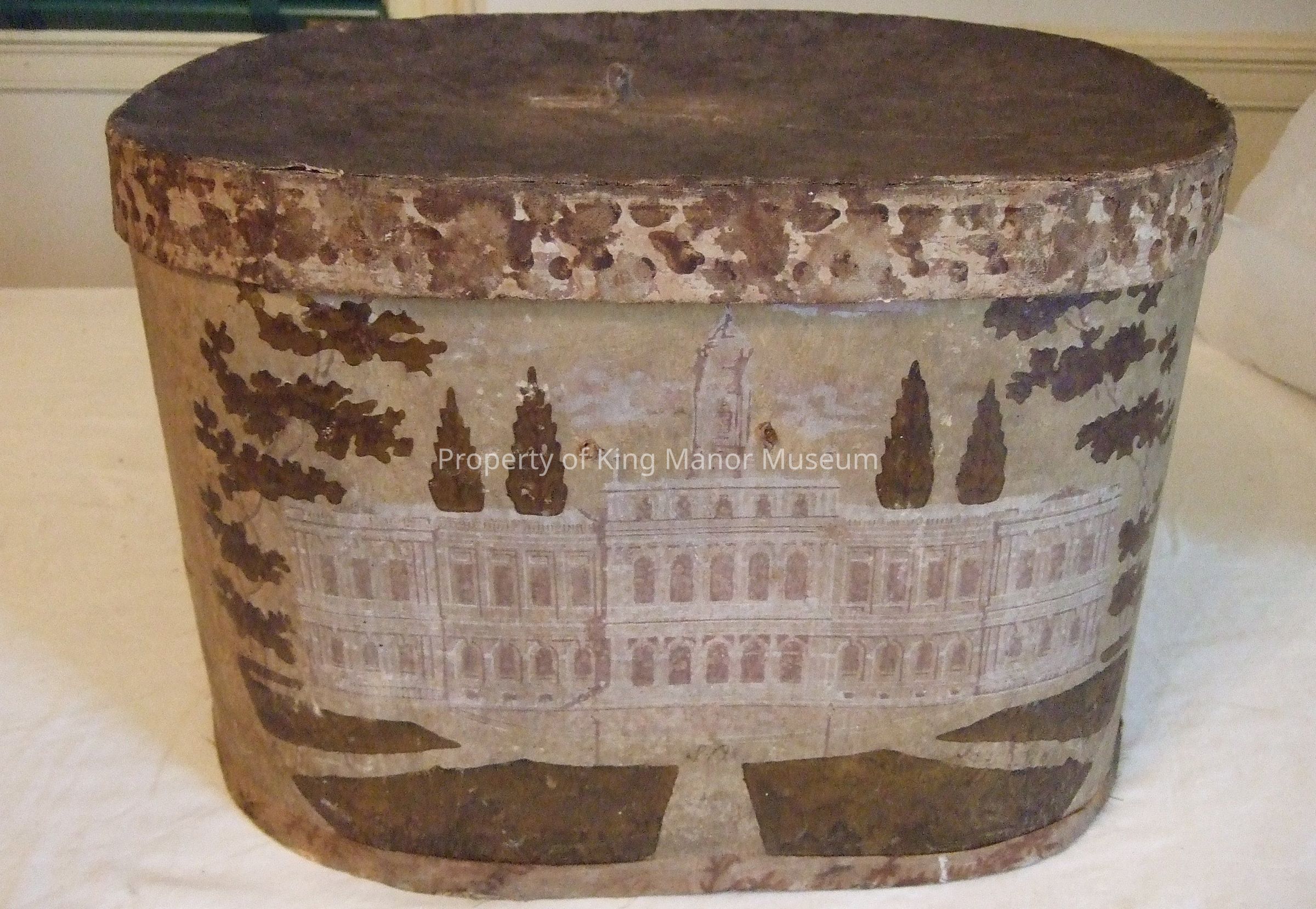 Cardboard bandbox of oval shape having a papered exterior featuring New York City Hall, with cover having papered extior as well featuring a repeat brown floral; the interior of the box is papered with a repeat floral dropout on turquoise ground, the cover interior is covered with a plainweave cloth of eiamond patterningCollection