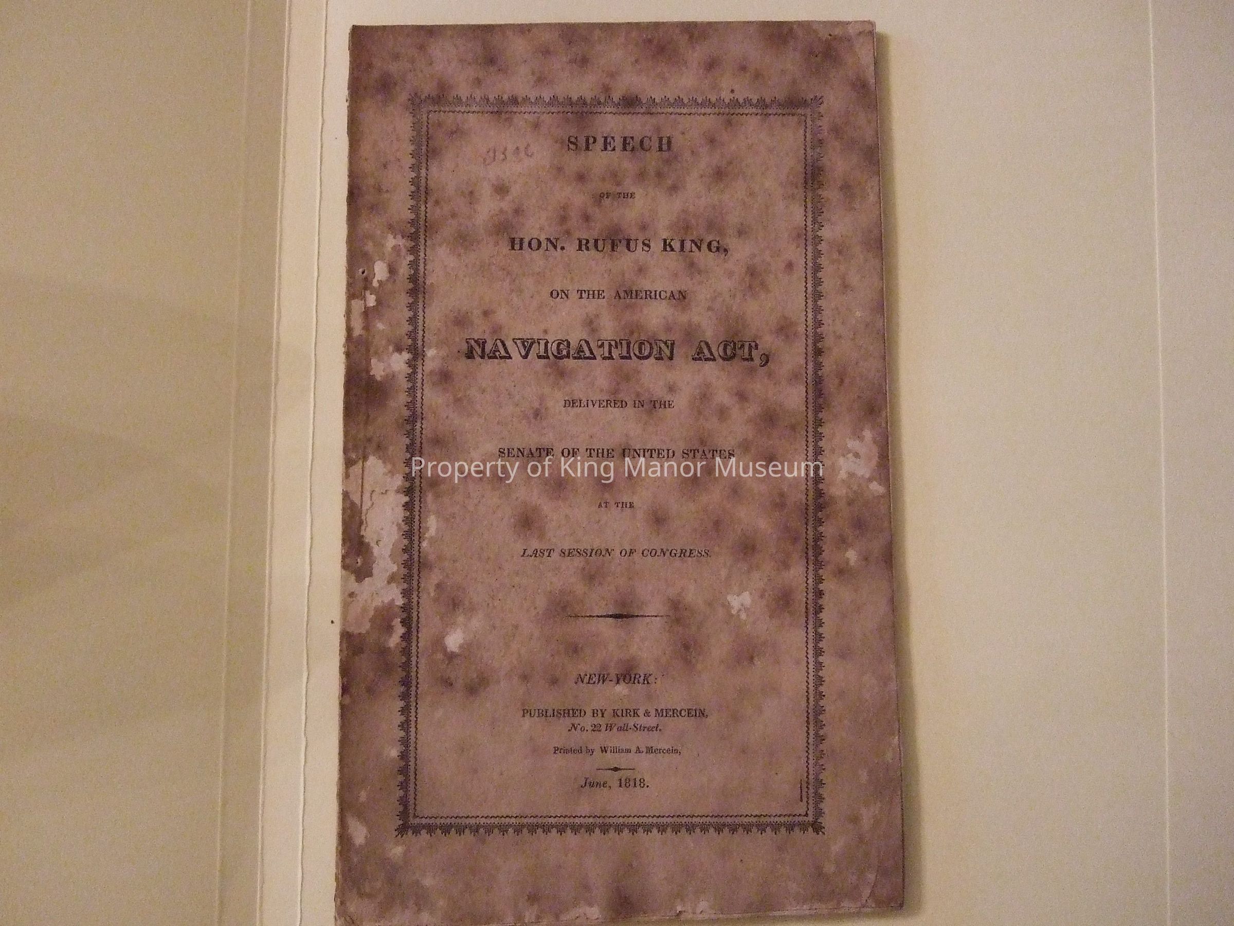 Paper booklet titled, "Speech of the Hon. Rufus King on the American Navigation Act, Delivered in the Senate of the United States at the Last Session of Congress"