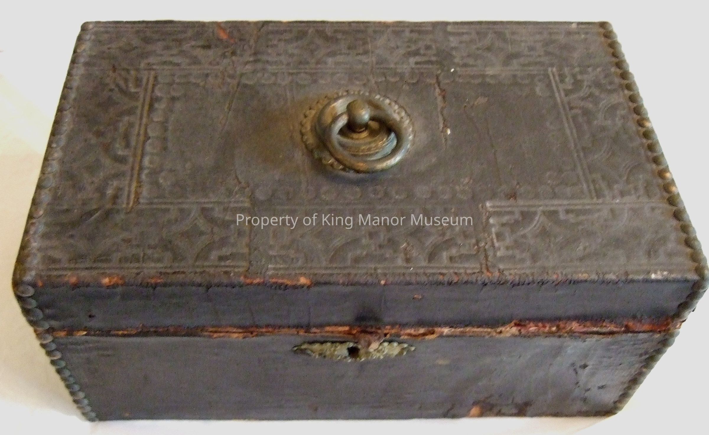 Tooled leather covered wood document box having self hinged lid fitted with brass ring loop handle, the box edged with brass tacks, the lid opens to reveal a red paper covered interior; the underside papered and bearing the message, "Collection