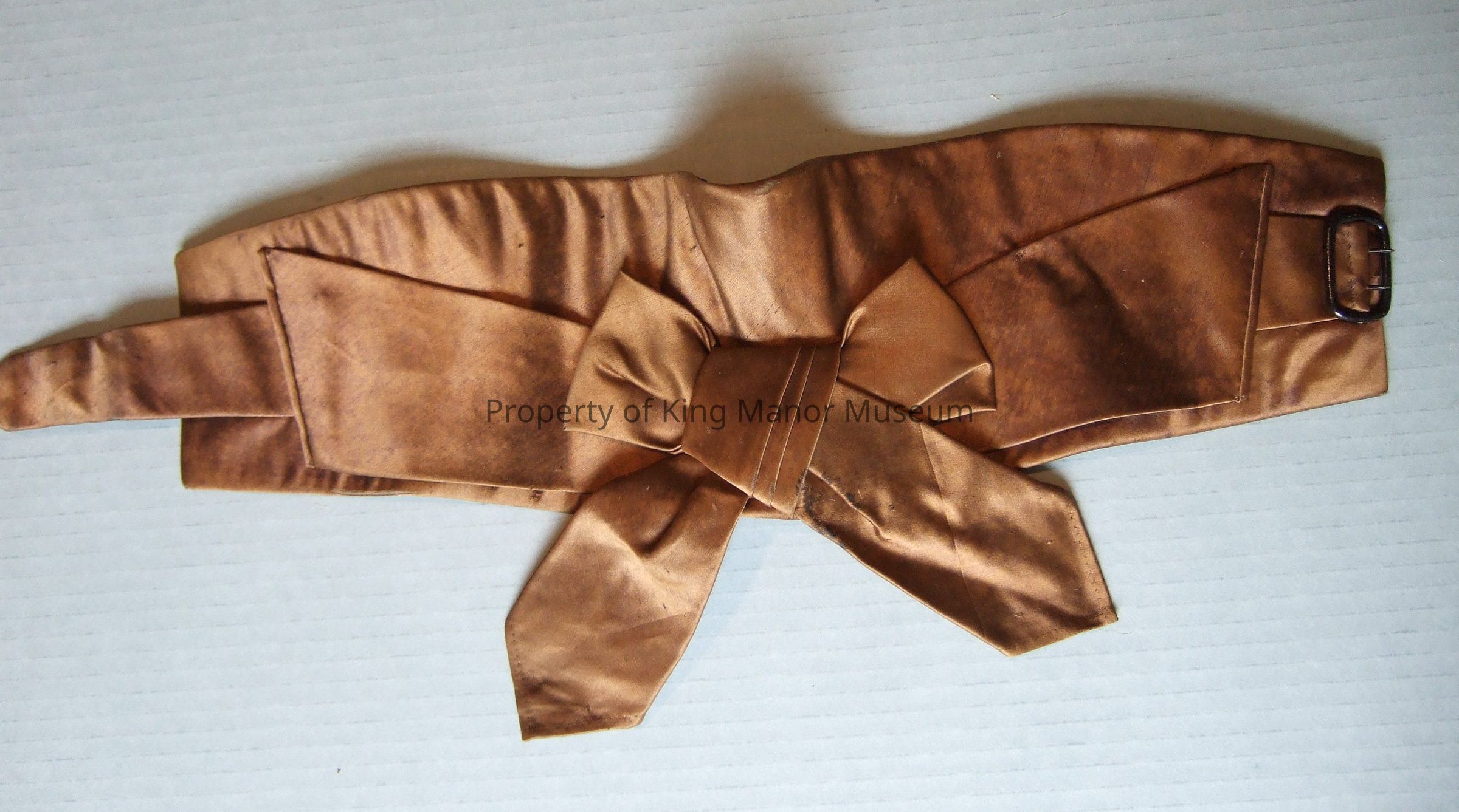 Satin buckled accessory comprising a stiffened, curved panel having opposing strap and buckle ends, centered by a decorative bow of same