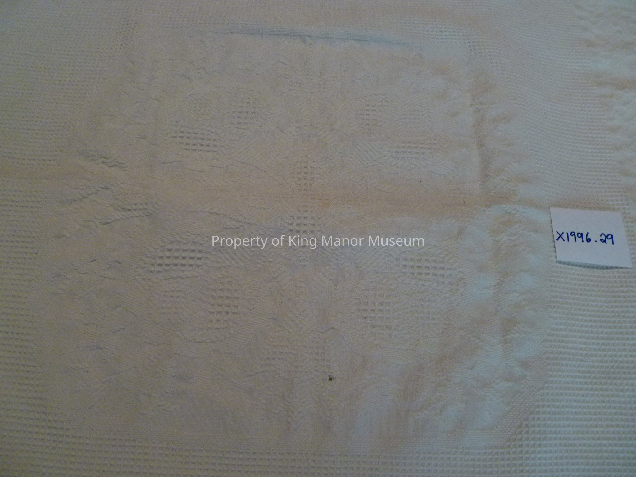 White woven cotton "jacquard weave," "outer border rectangular checkerboard of chain alternating with raised dots. Inner border floral and leaf on width wave on length. Center medallion of 4 flowers and leaves in square of honeycomb. Hemmed lengthwise, selvage on width" (worksheet text)Collection