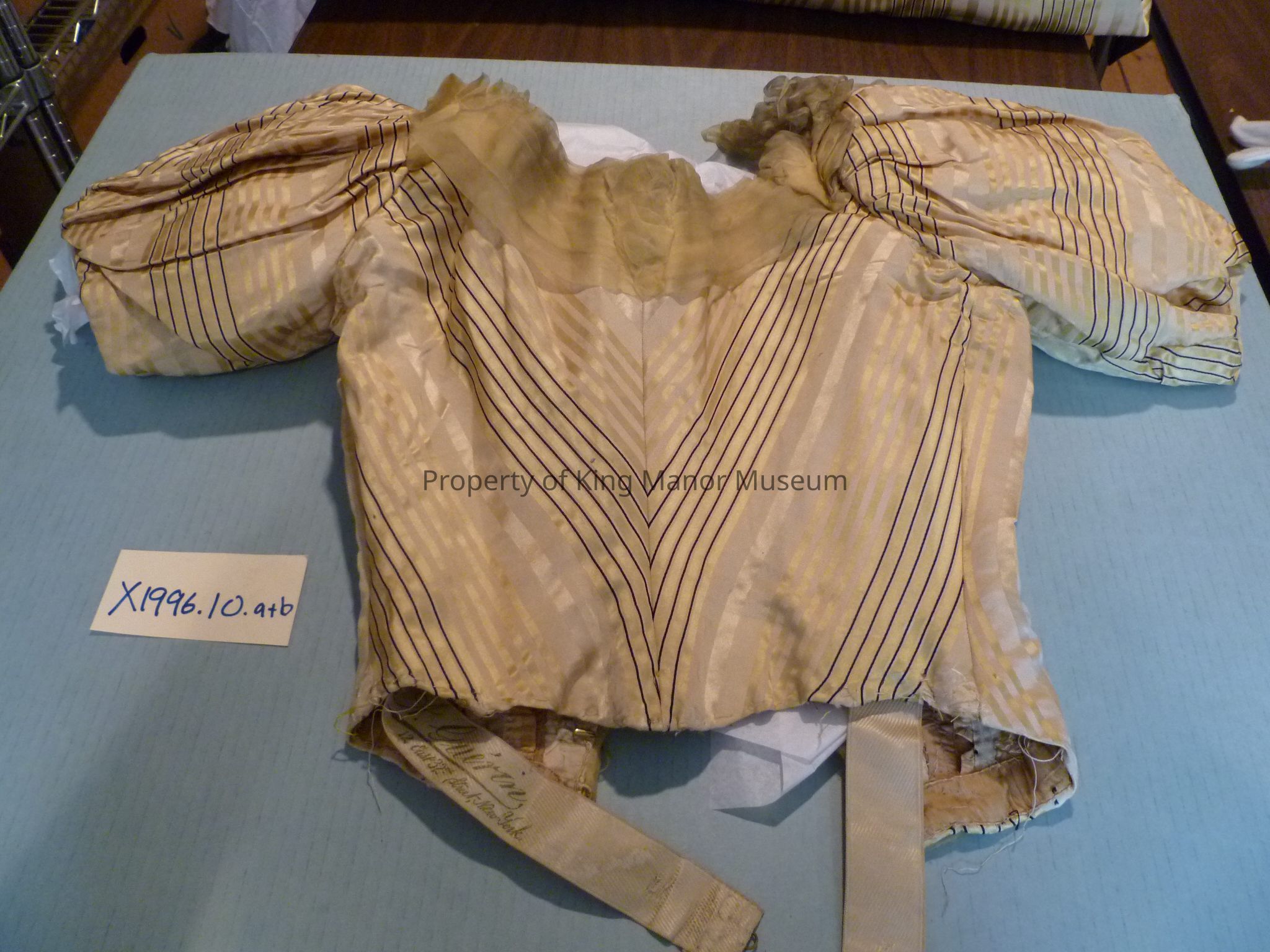 c. 1890s? Two piece dress of beige/gold silk taffeta, the boned bodice having puff sleeves, round neckline decorated with tulle ruffle; the skirt gathered and full and finished at hem with tulle ruffle (matching skirt in Costume Box 207-49)Collection