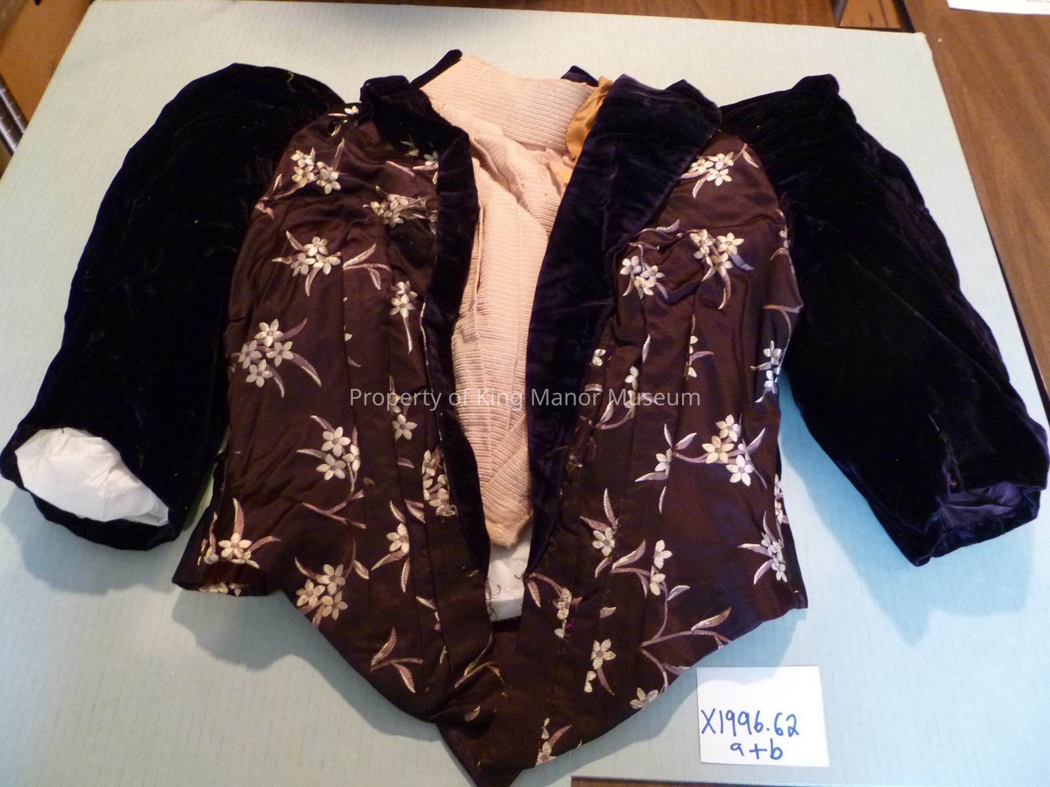 Edwardian Two piece eggplant colored and pink floral spray decorated silk taffeta dress, the bodice having velvet sleeves and dropped waist is fitted at front closure with a pink dickie, the full gathered skirt is of same eggplant and floral silk taffetaCollection