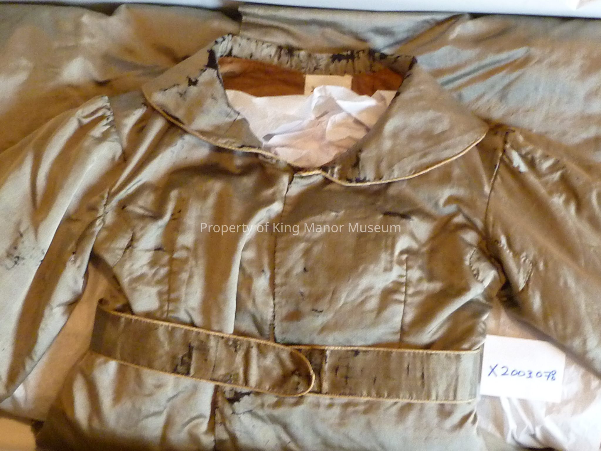 Handsewn beige silk coat or pelisse of late 18th century styling, having cutaway round collar, empire waist with self belt, and fitted long sleeves; the coat of A-line styling having gathered center back waistCollection
