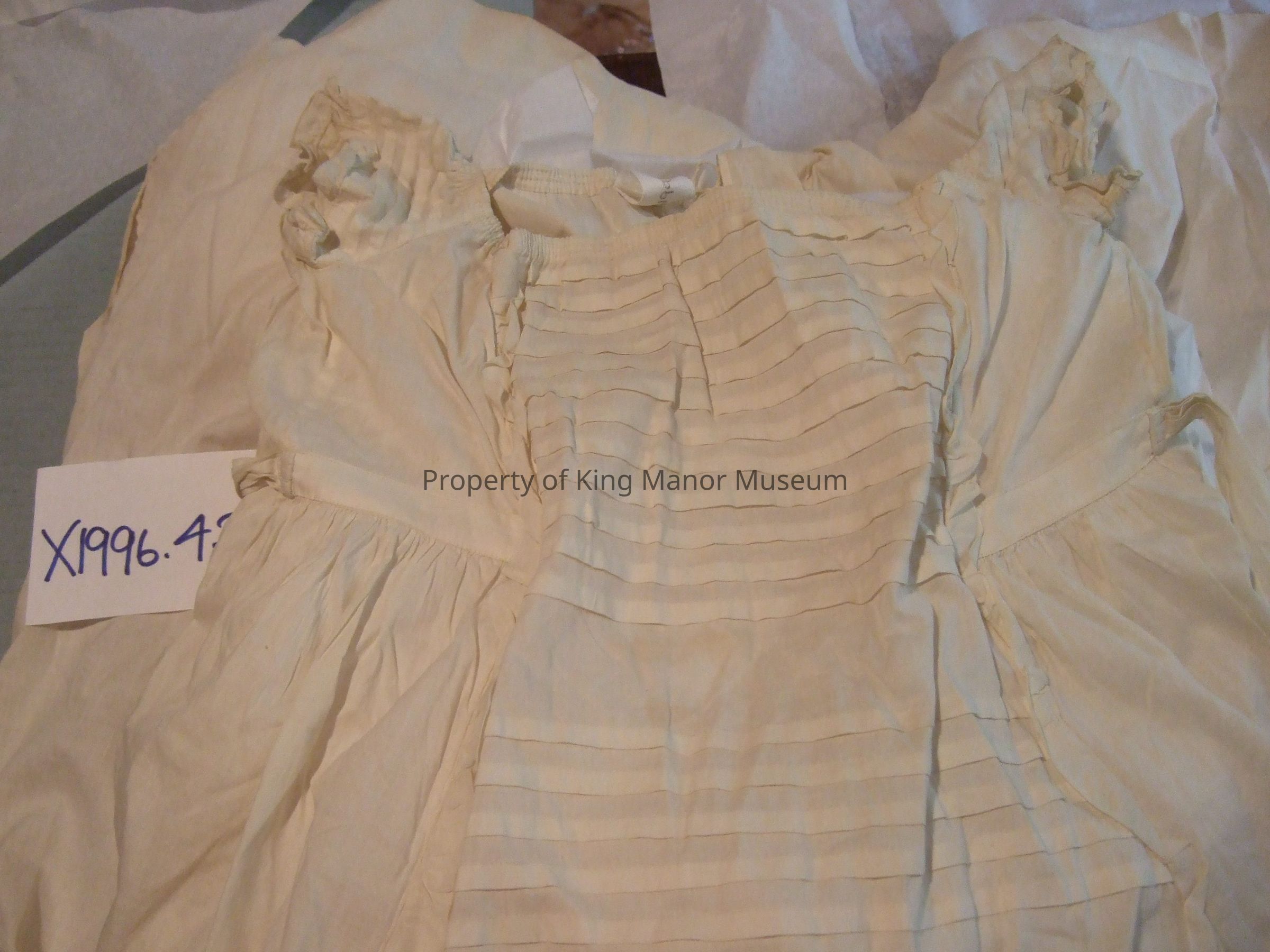 Off-white cotton lawn baptismal gown having square neckline, tucked, short sleeves, empire waist, the center panel of long gown features multiple tucks from neck to hem; self tie at back of waist, drawstring closure at back of neck; the gown is machine sewnCollection