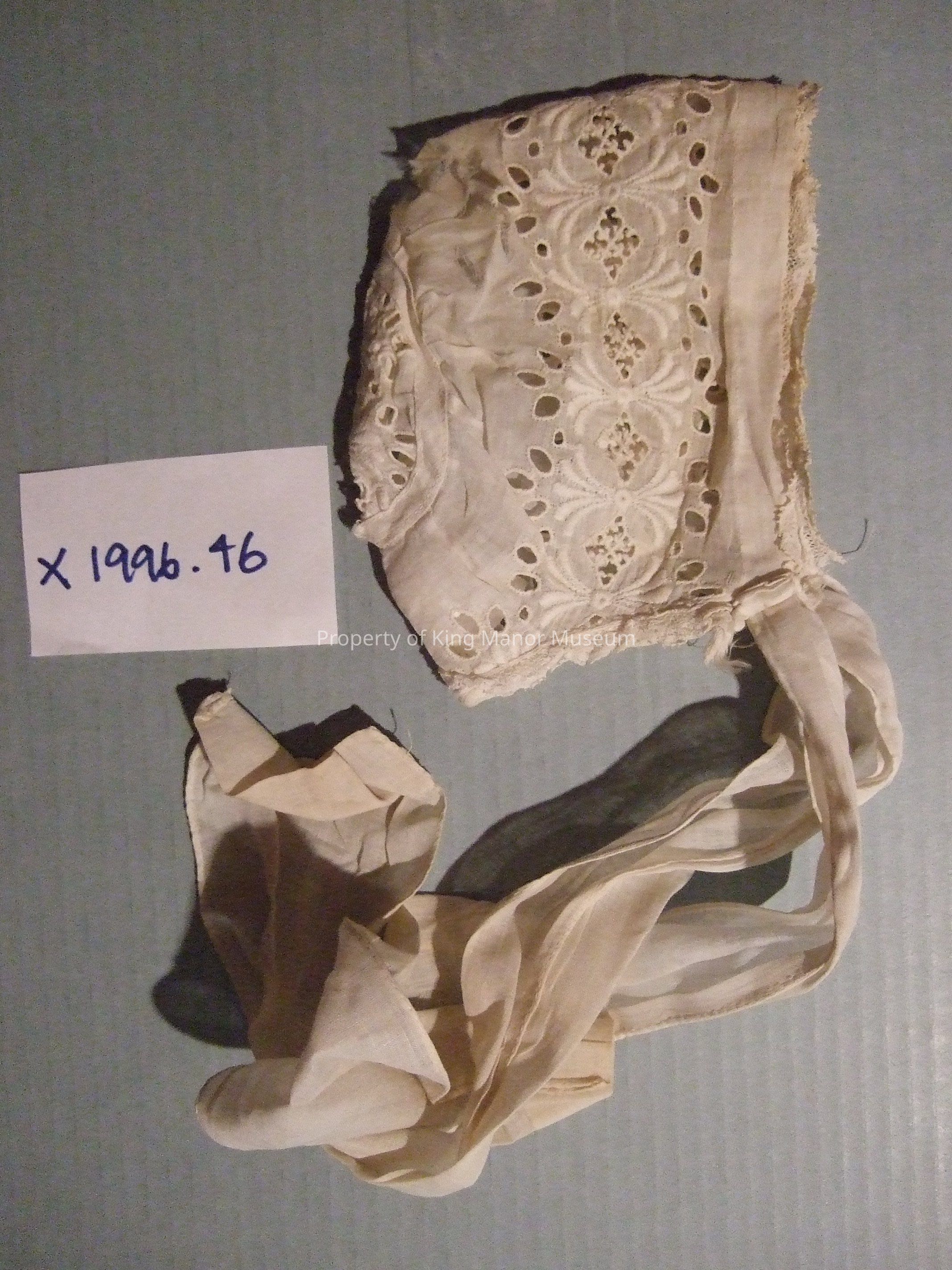 Cotton cutwork baby bonnet; the bonnet formed from circular patterned cutwork back to tie under chinCollection