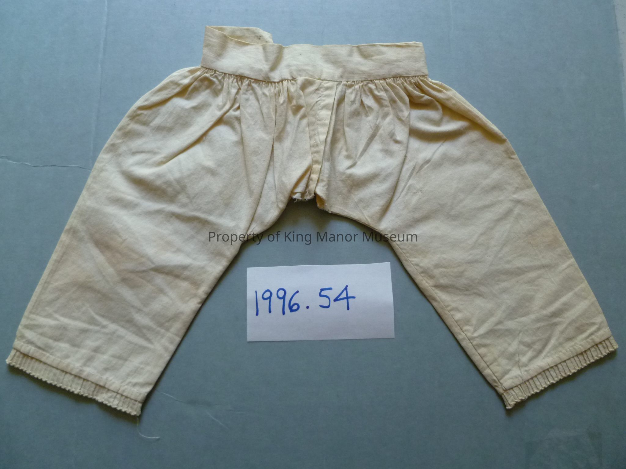 Off-white cotton drawers for doll having pleats at hem and back closure on waistband