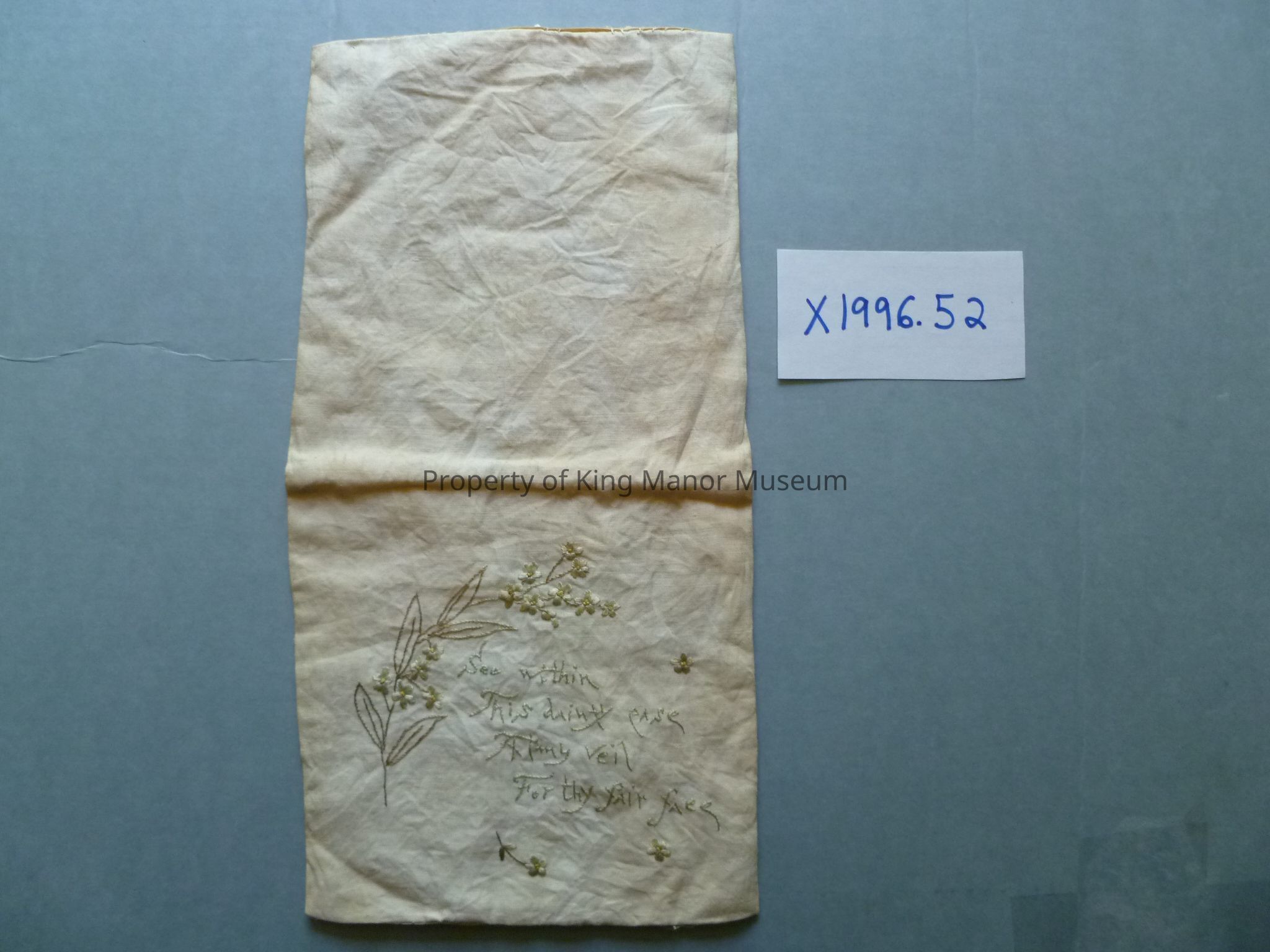 Off-white silk bifold case having the embroidered message, "See within this dainty case a filmy veil for thy fair face"