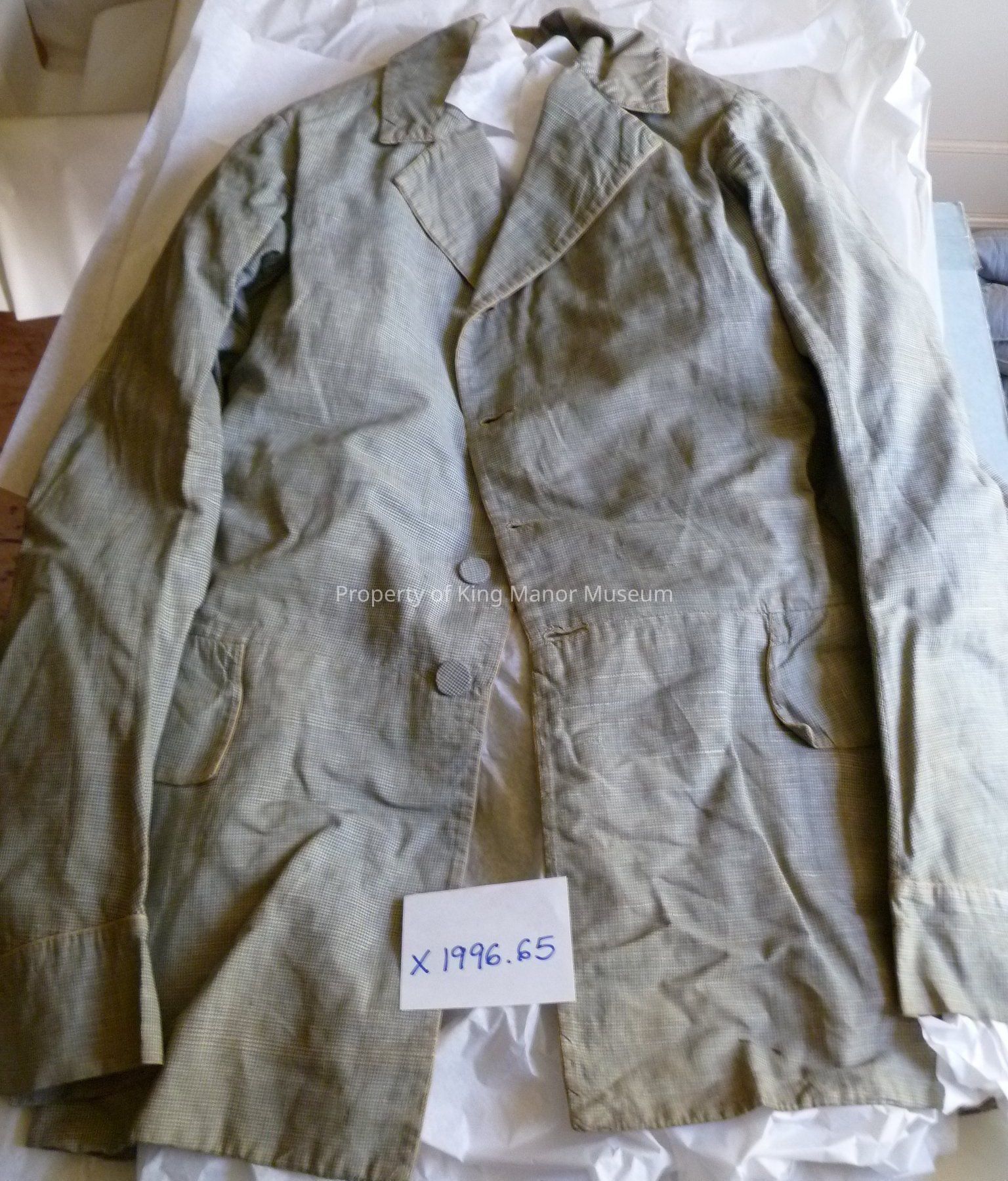 Man's short coat of blue and white houndstooth check, front covered button closure, peaked lapels, and flap pockets