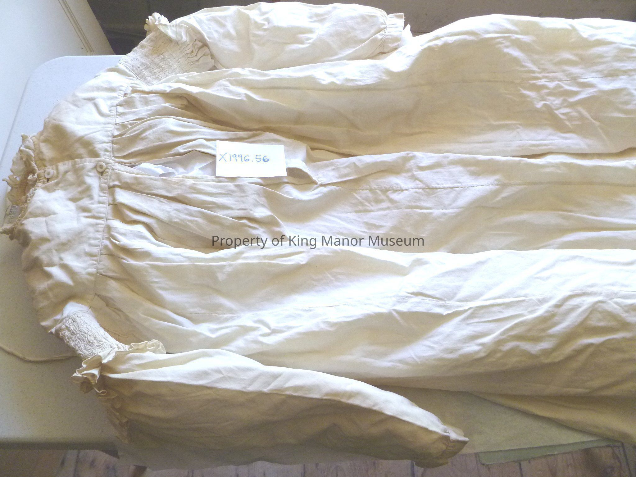 Off-white cotton nightgown having straight fitted sleeves having smocked upper arms, ruggled neckline, two button back closure at neckline, the gathered gown body falls from top yokeCollection