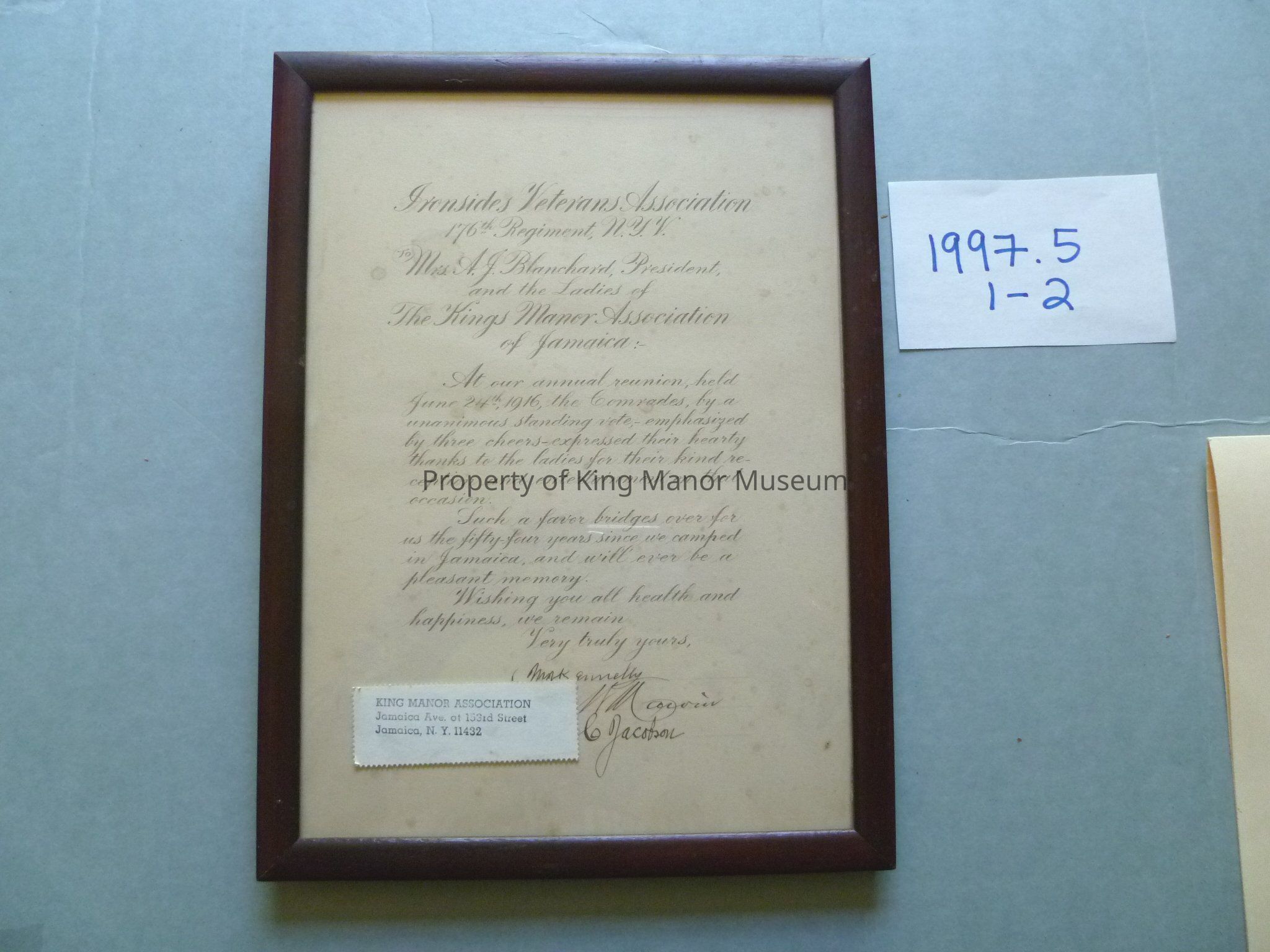 Caligraphic letter from the Ironsides Vererans Association to Mrs Blanchard and the Ladies of the King manor Association of jamaica thanking them for a reunion held in June 24 1916Collection