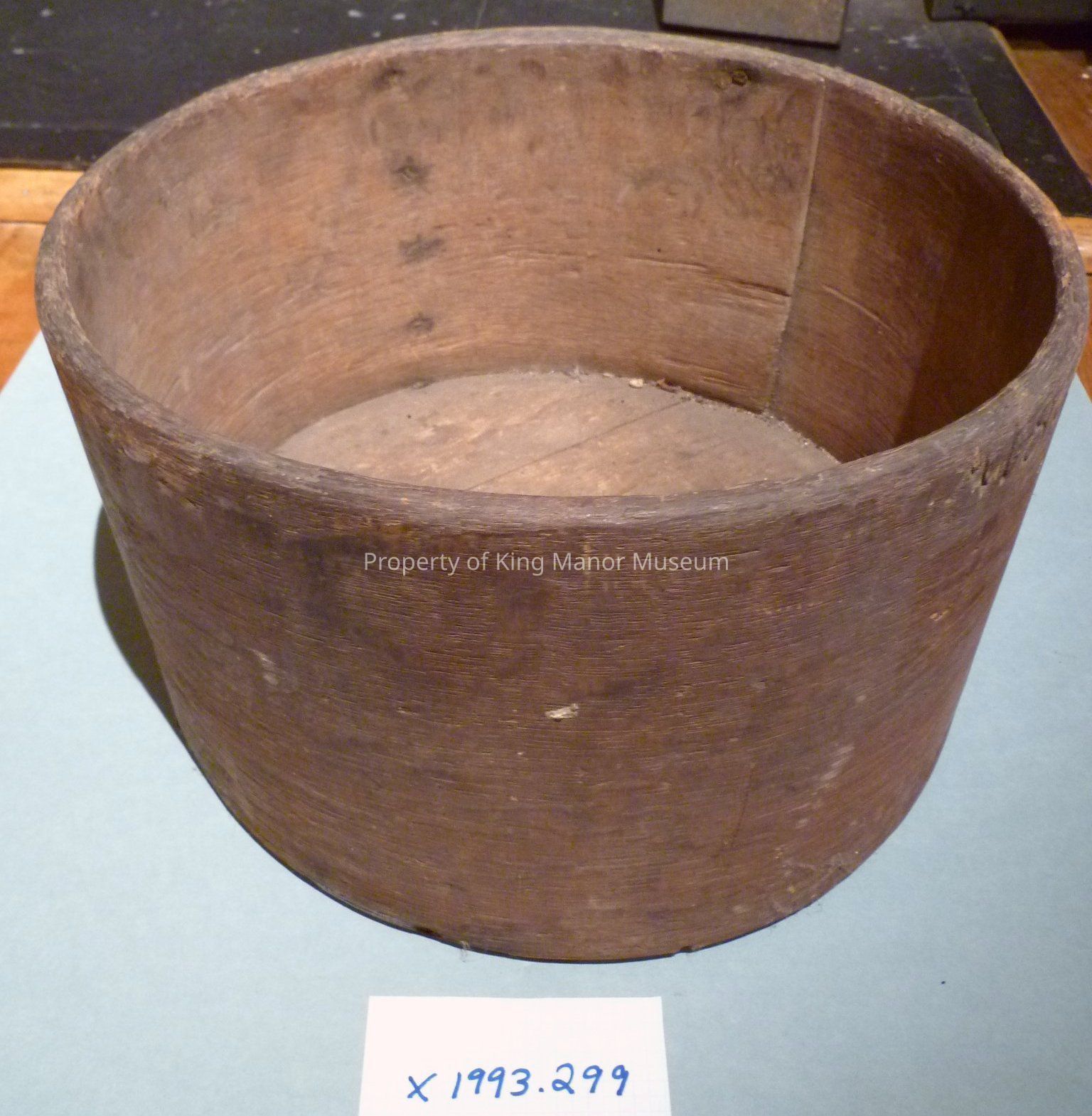 Wood half bushel measure of cylindrical shape bearing the mark, M1800; KMM label indicates, "made in 1800, used by the Denton family of Jamaica
