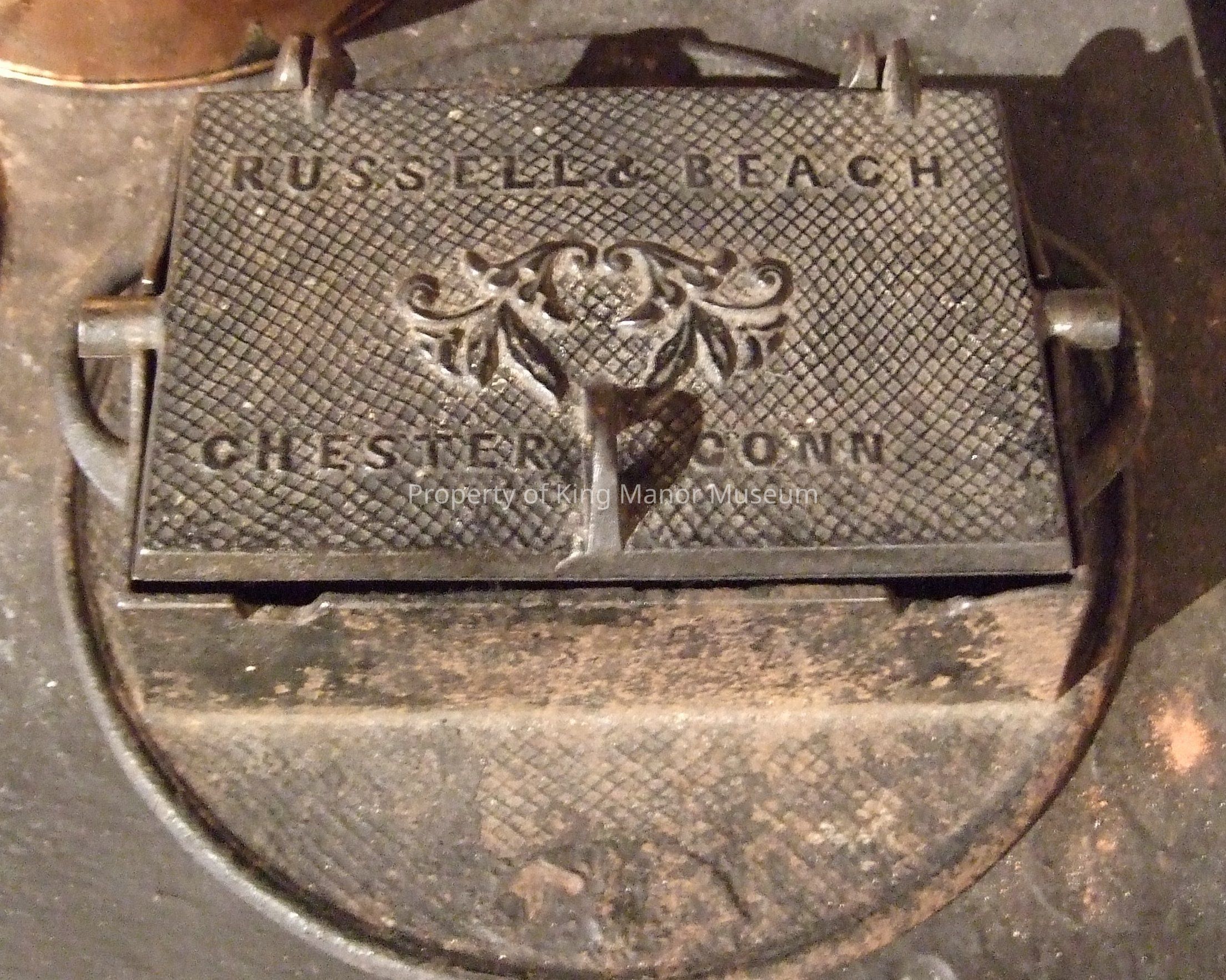 Cast iron waffle iron for stovetop use of box shape having hinged lid which opens to reveal press patterns, set on circular base; the maker, Russell & Beach Chester, ConnCollection