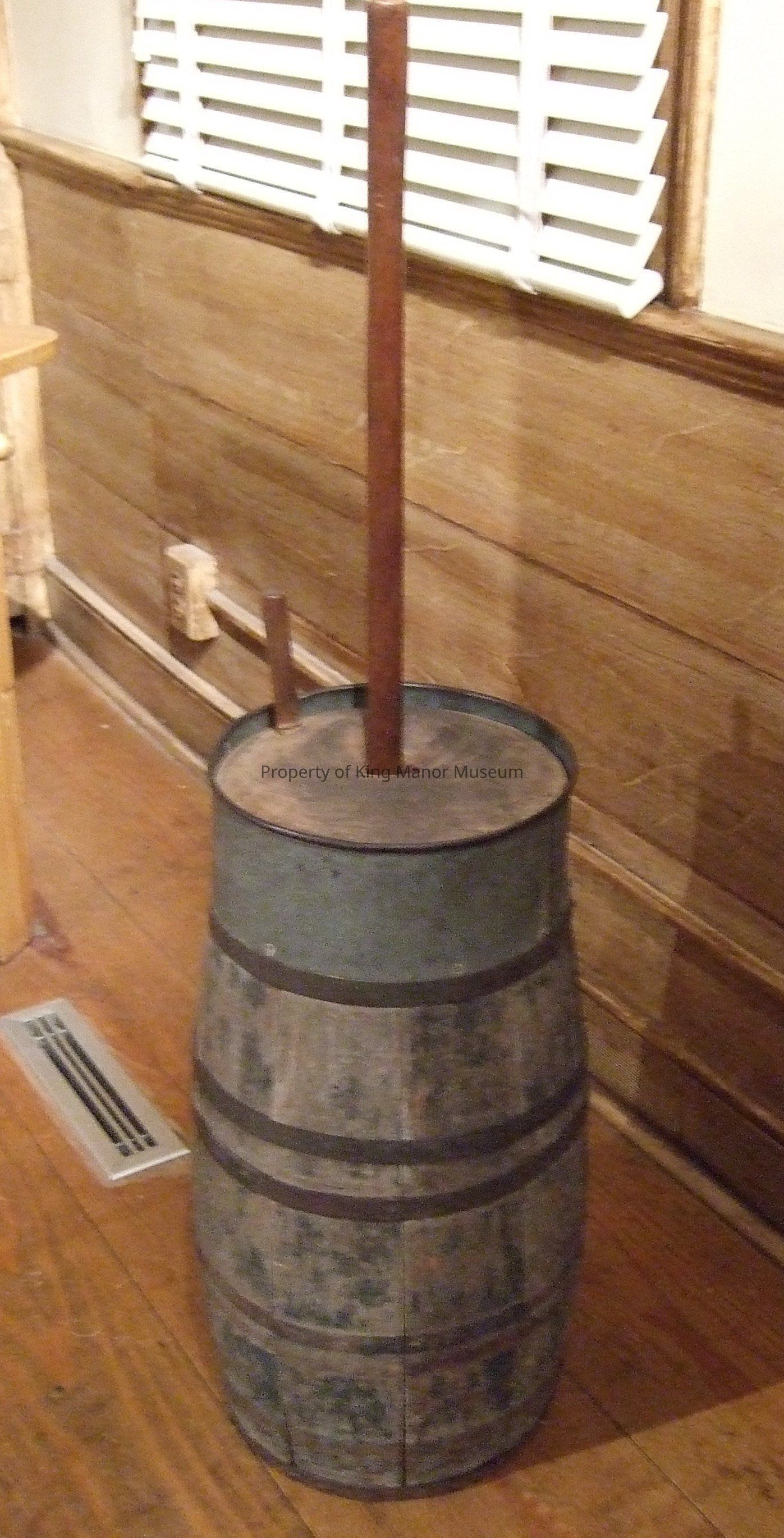 Butter churn of tall barrel shape comprising plunger, bucket having iron straps and galvanized metal collar, press and bucket topCollection