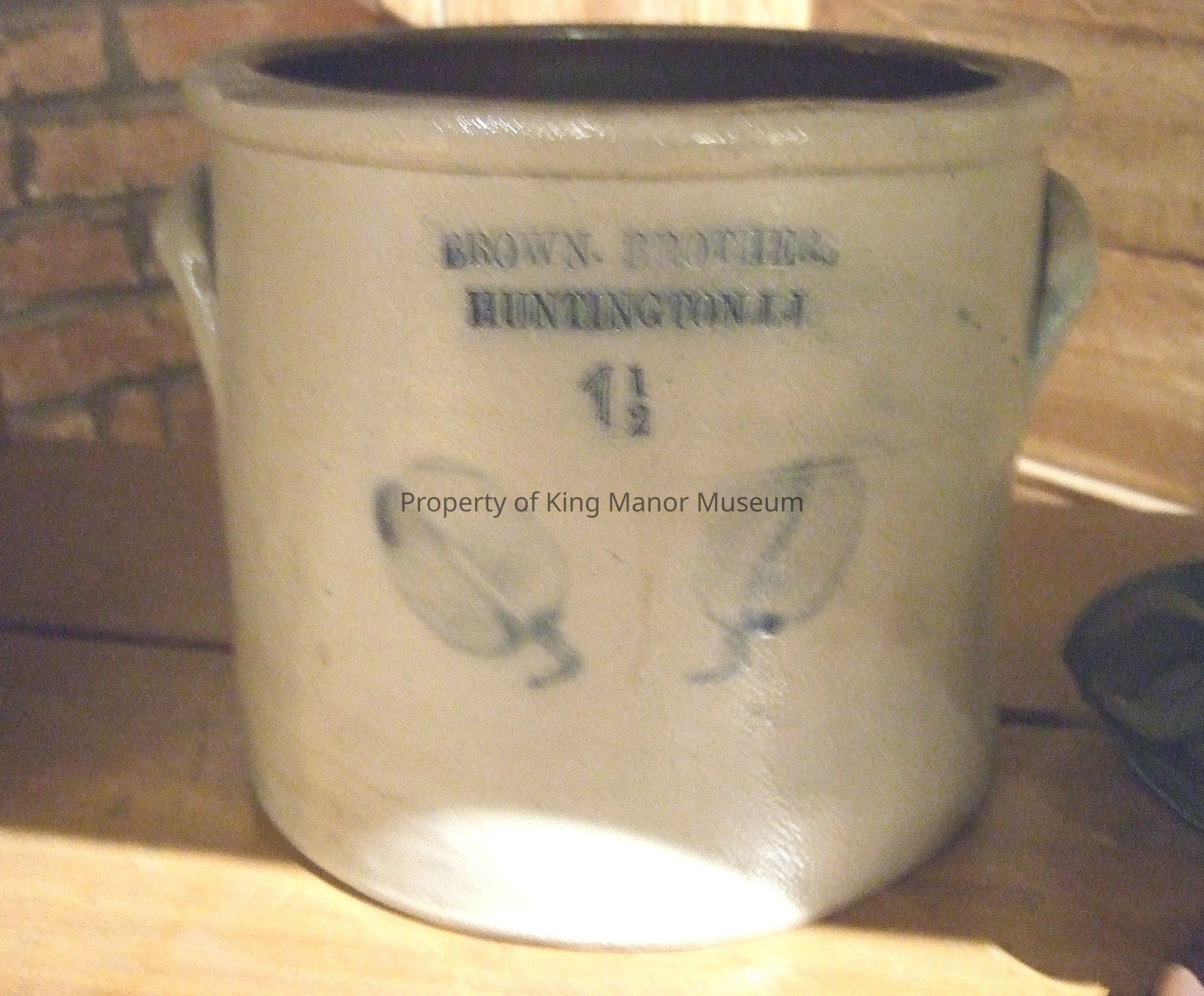 Stoneware crock having applied side handles dedcorated with blue slip fruit halves and stamped BROWN BROTHERS HUNTINGTON L I 1 1/2Collection