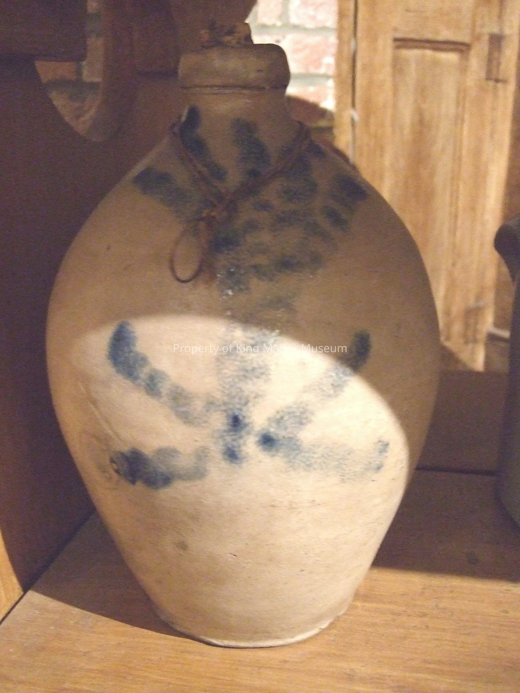 Stoneware jug of ovoid shape having thumb handle and narrow, short neck, blue slip decoration on body of stylized floral
