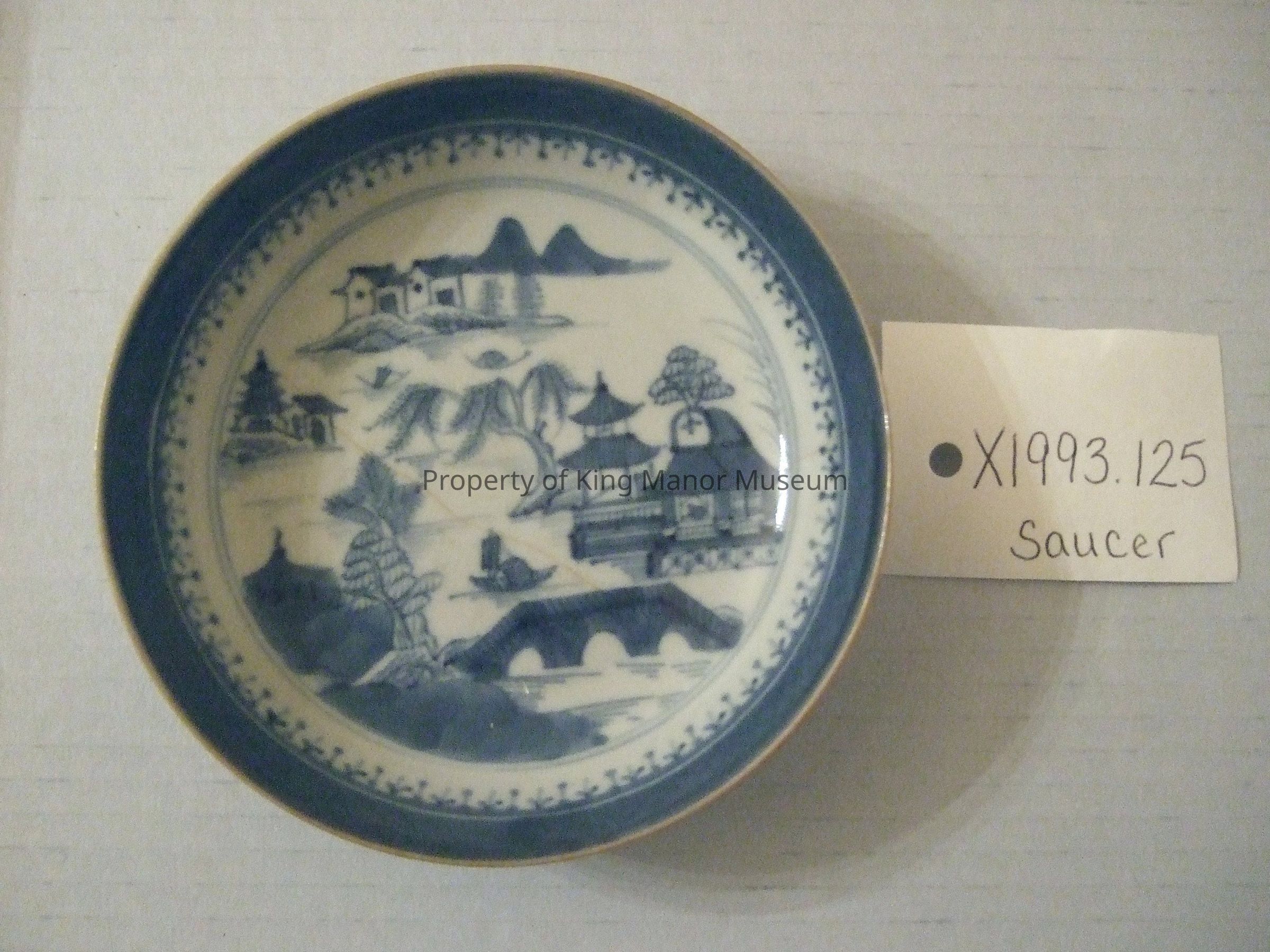 White porcelain saucer having Blue Willow design; the rim having western decoration