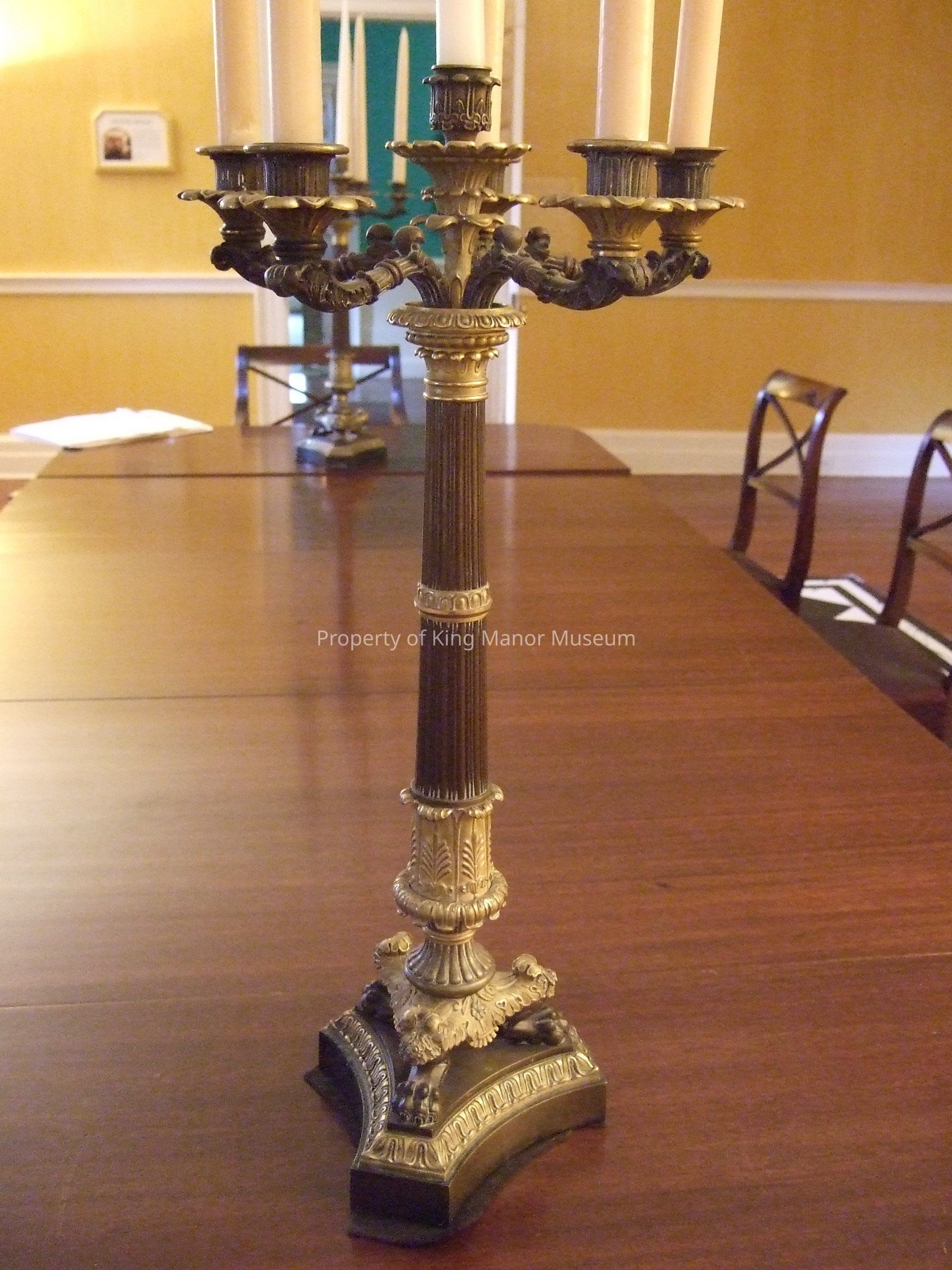 Bronze 6-arm candelabrum, one of pair, supported on reeded column having acanthus base, supported on lion paw tripod base; the patinated bronze accented with gilt bronze elementsCollection