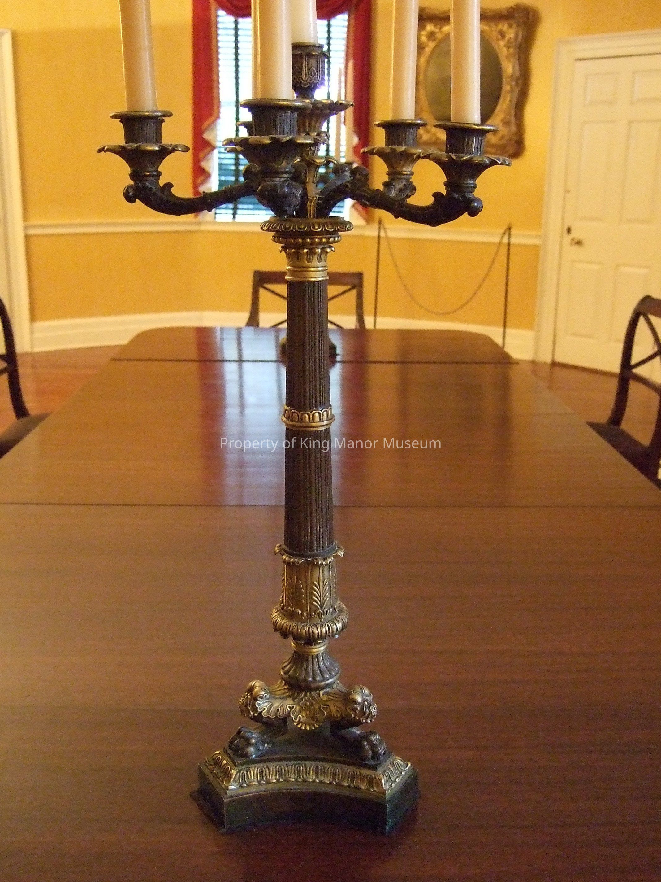 Bronze 6-arm candelabrum, one of pair, supported on reeded column having acanthus base, supported on lion paw tripod base; the patinated bronze accented with gilt bronze elementsCollection