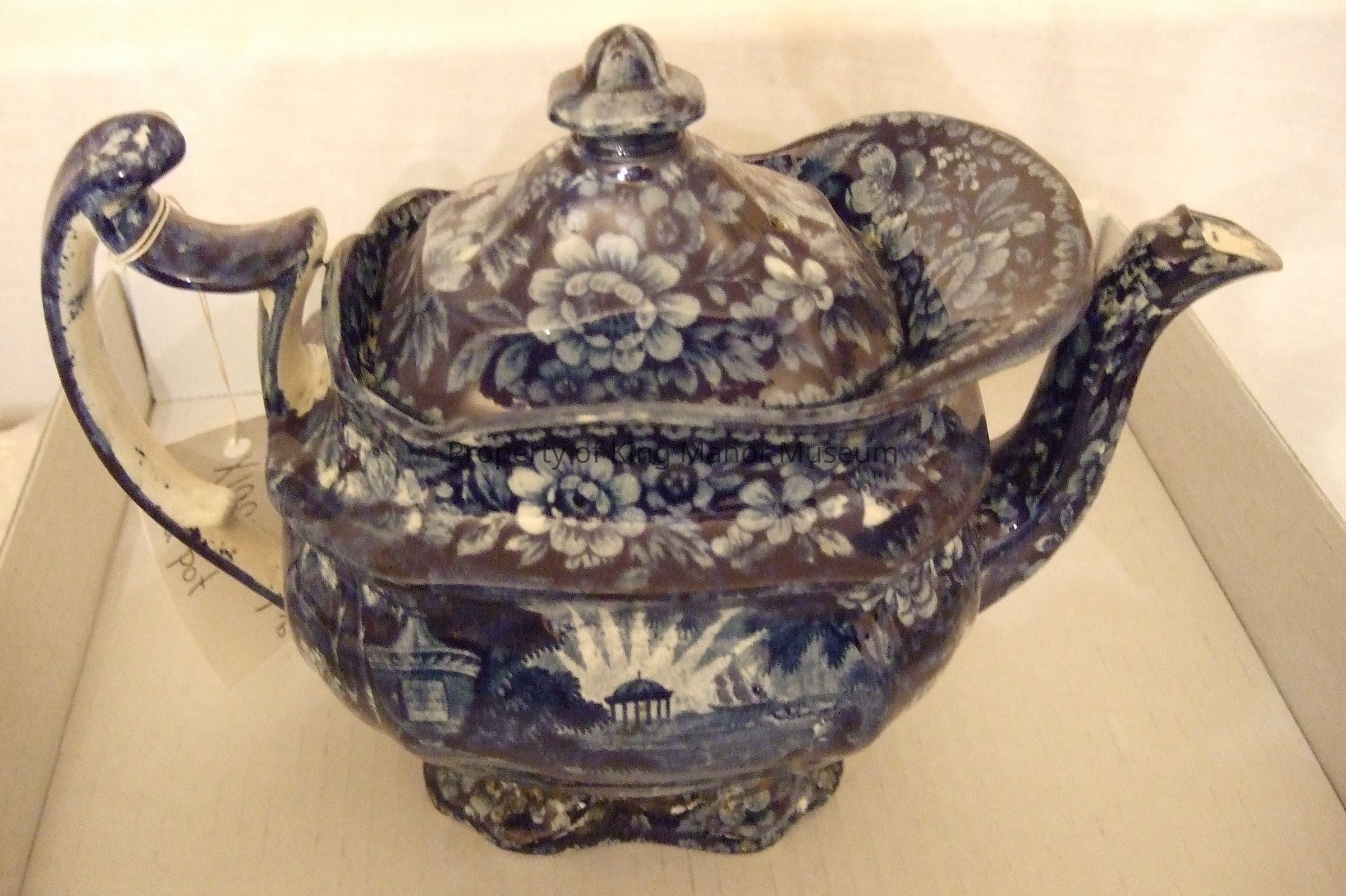 Blue and white transferware teapot with cover having an all over pattern of white florals framing a classical scene featuring a temple, a seated figure and urn monument (Ben Franklin's Tomb)Collection