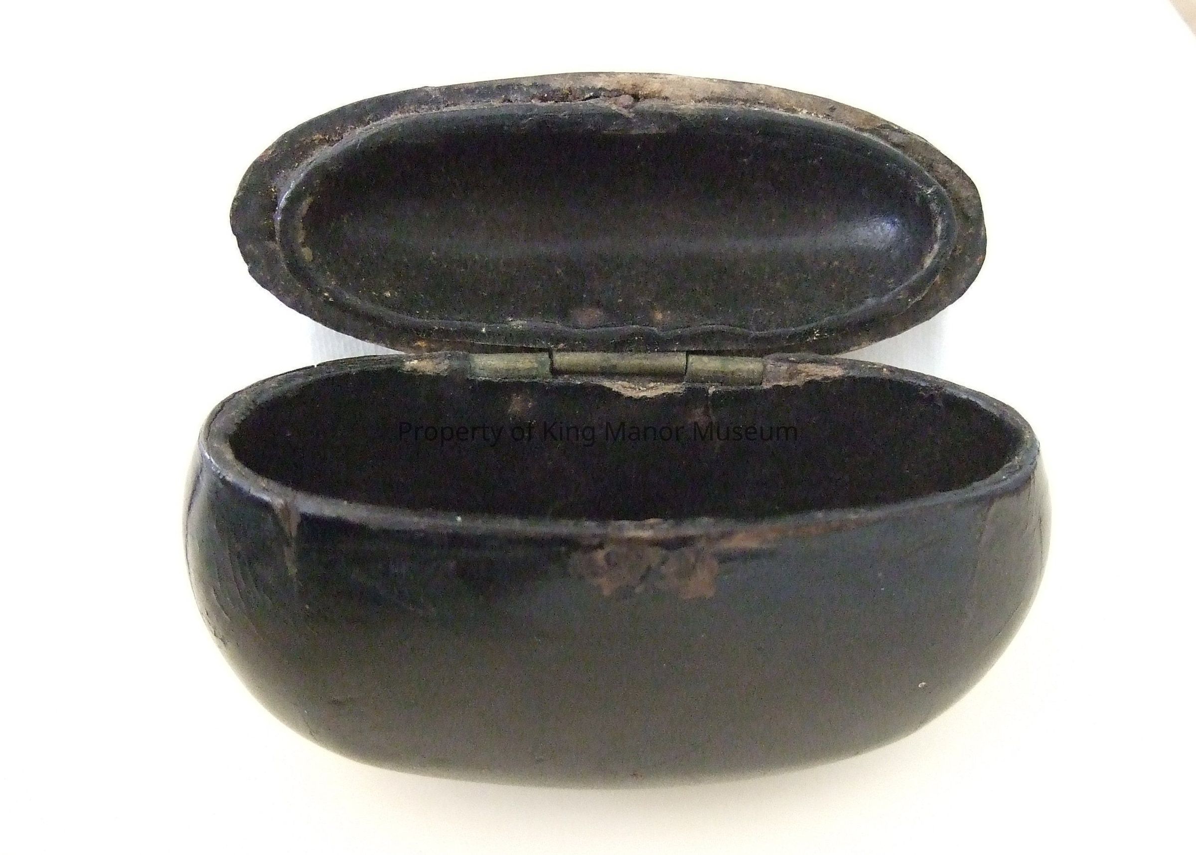 Lacquered wood hinged box of oval shape bearing two labels: K.M.A. #6 IV C-18 / NONES