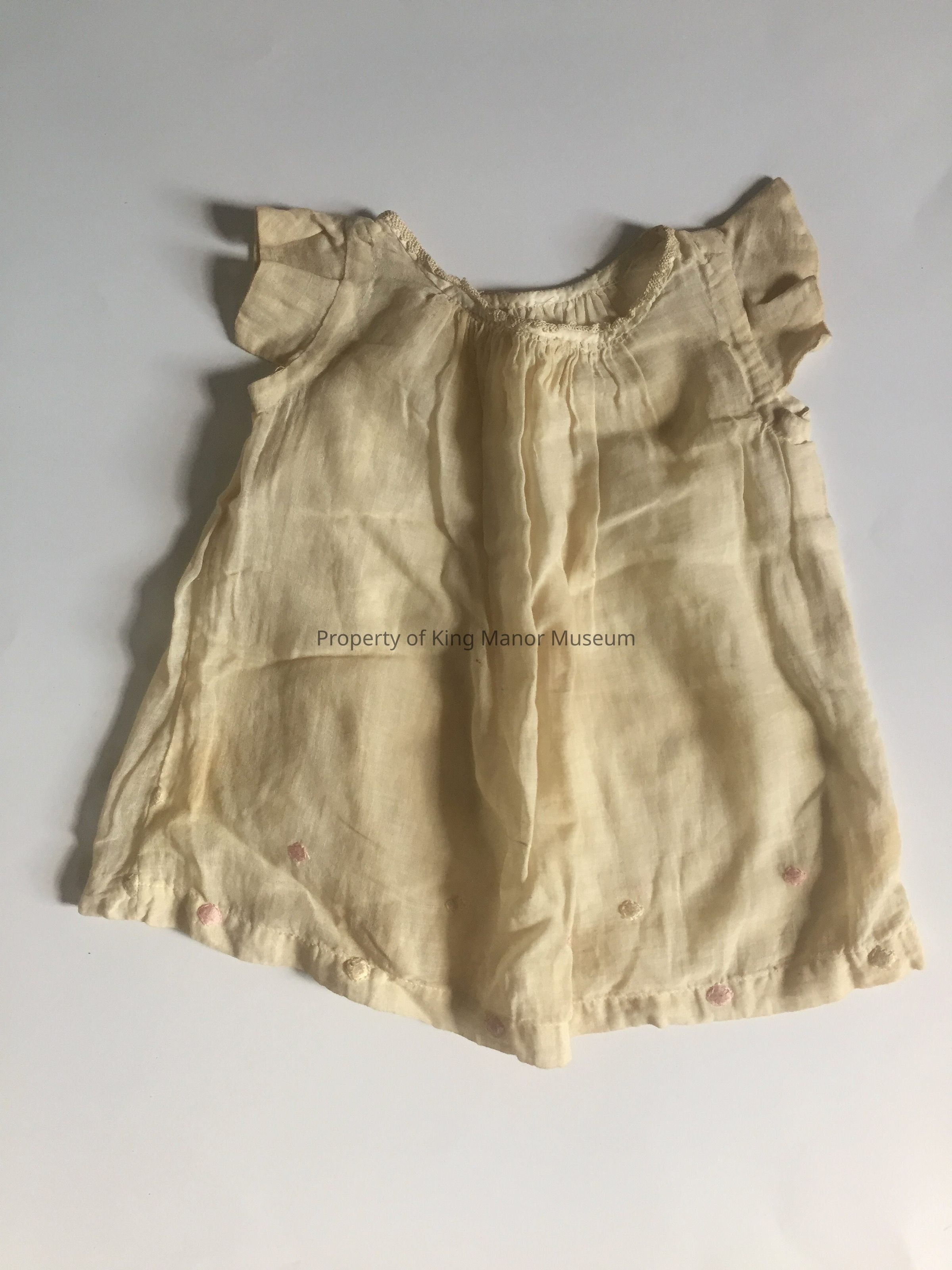 Short sleeved doll shift with decorative pink and white filled in threaded dots spaced around bottom