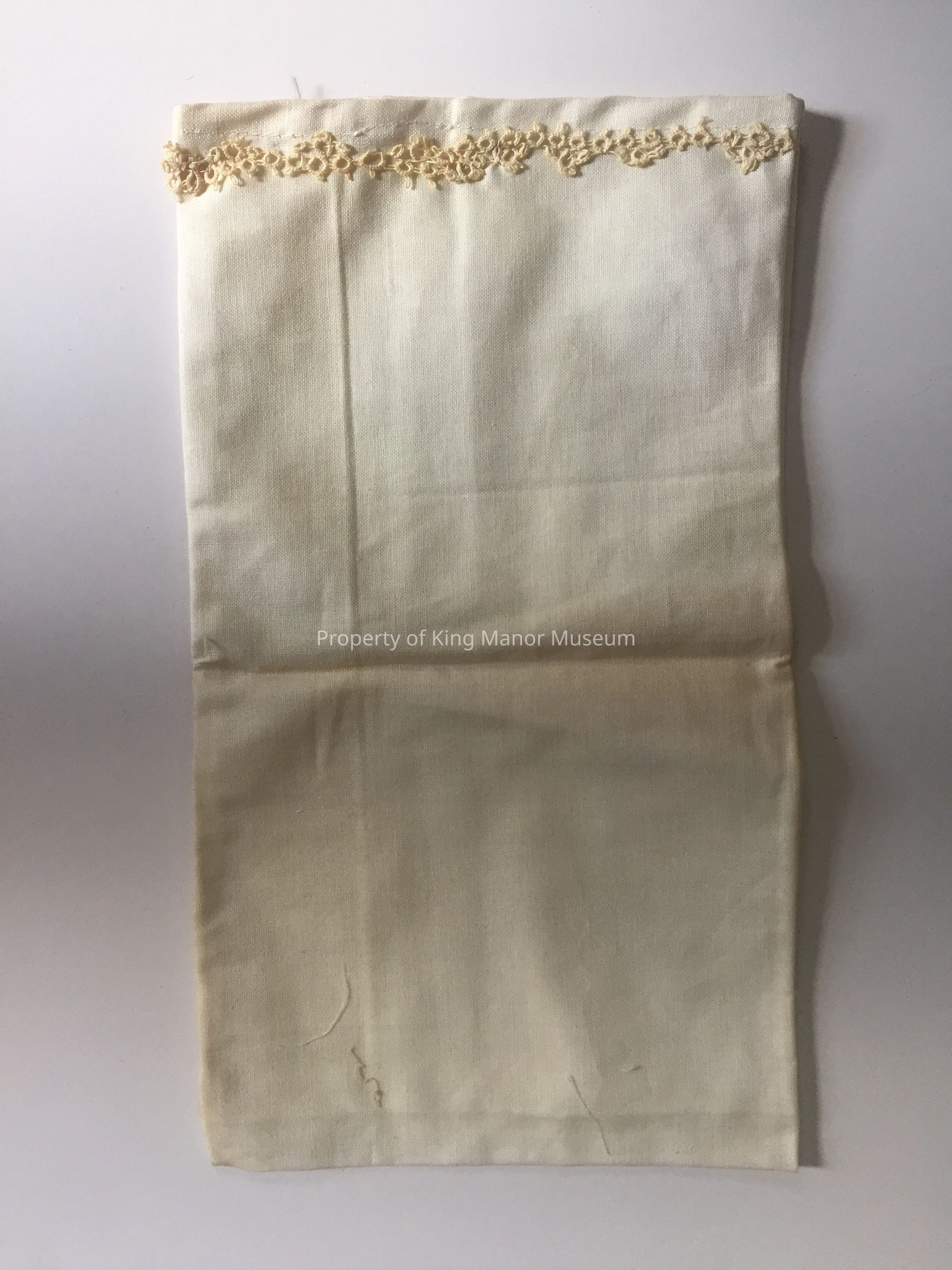 Single linen doll pillowcase with decorative border along opening. Bigger version of x2009.50.69