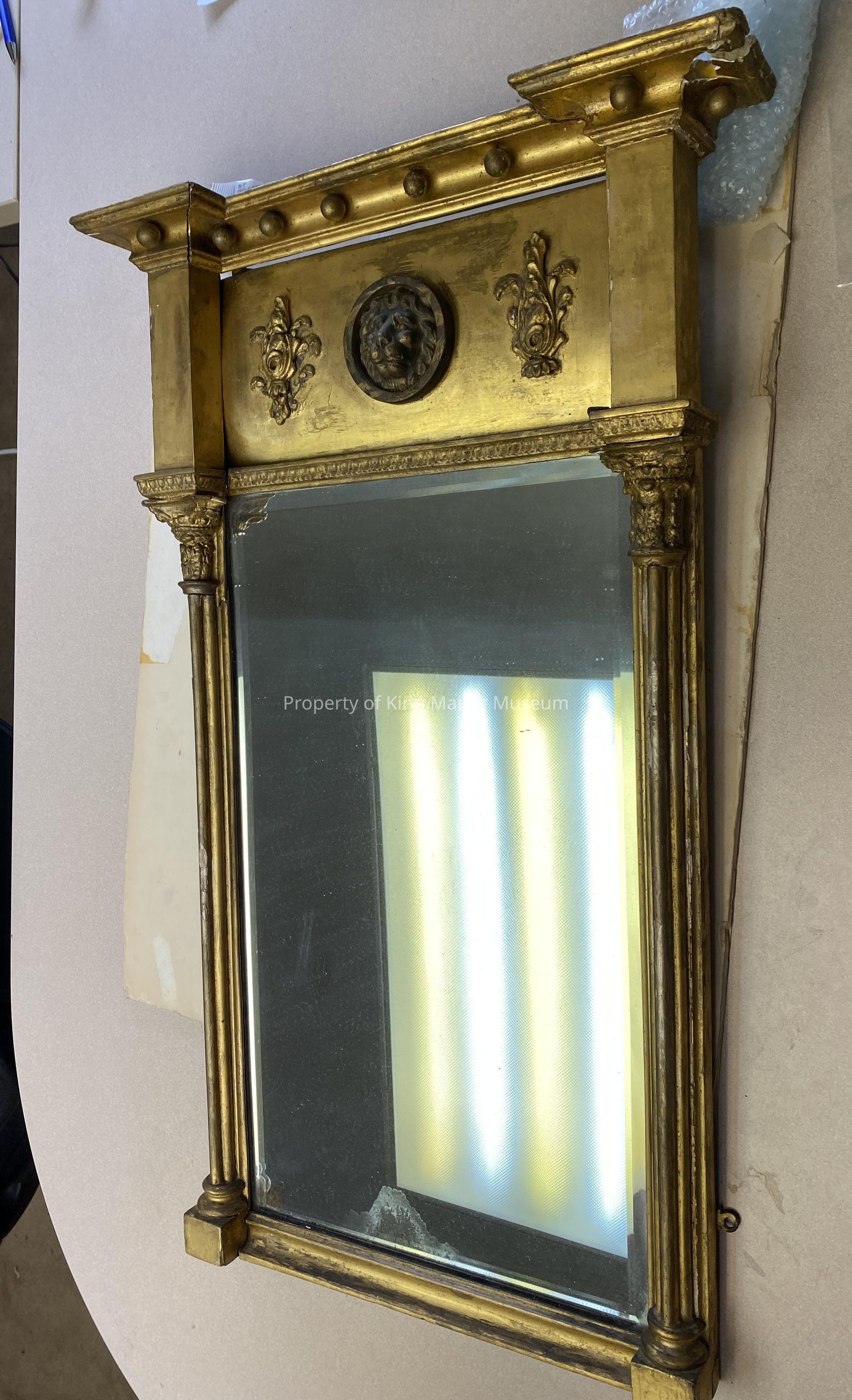 Empire mirror with gold painted wood frame, having gesso applied decorations featuring a lion medallion in center.Provenance