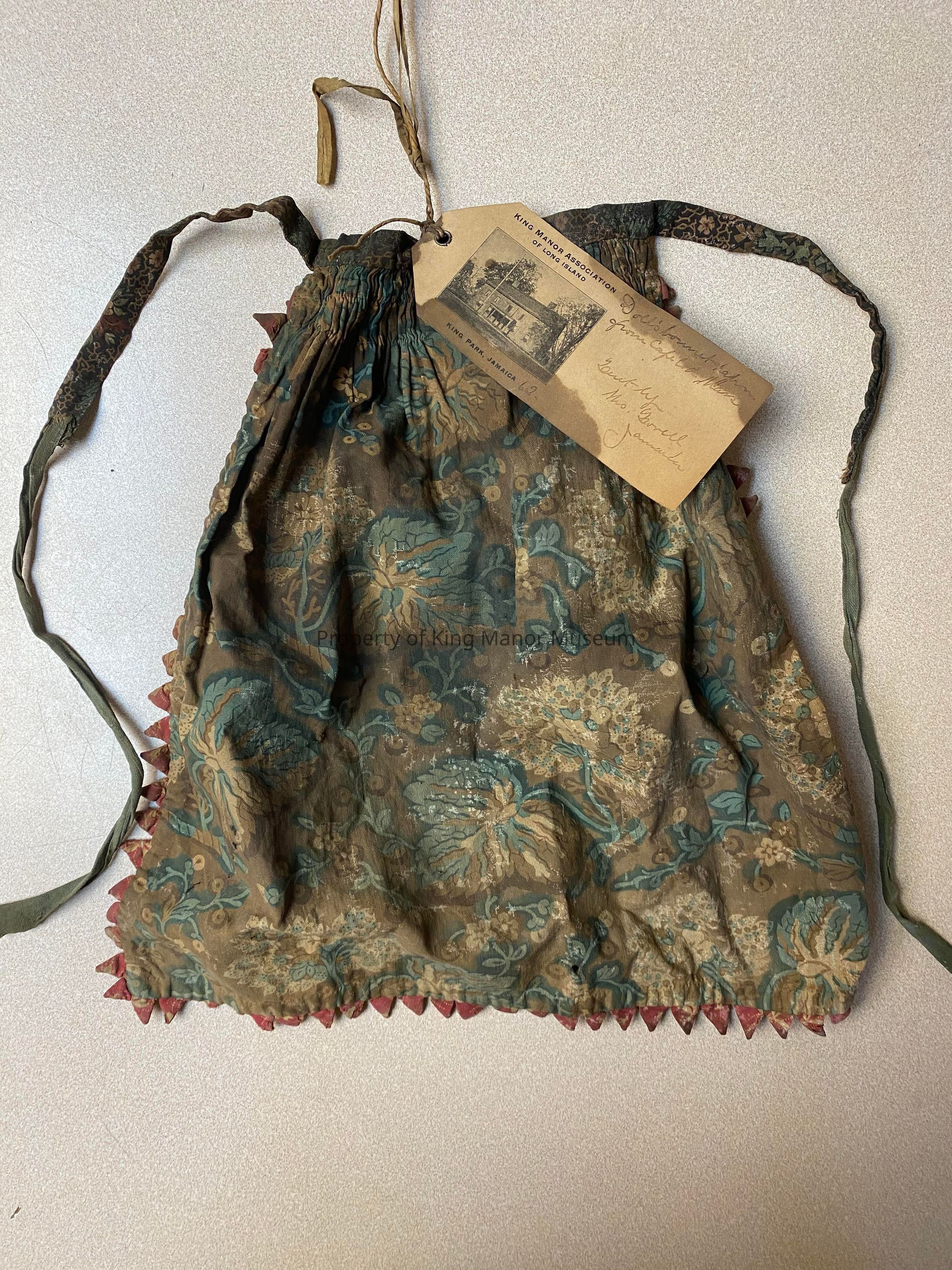 Doll apron having brown background and dark green leaf pattern, with maroon triangular scallops aling rim *found in chest drawer in basement