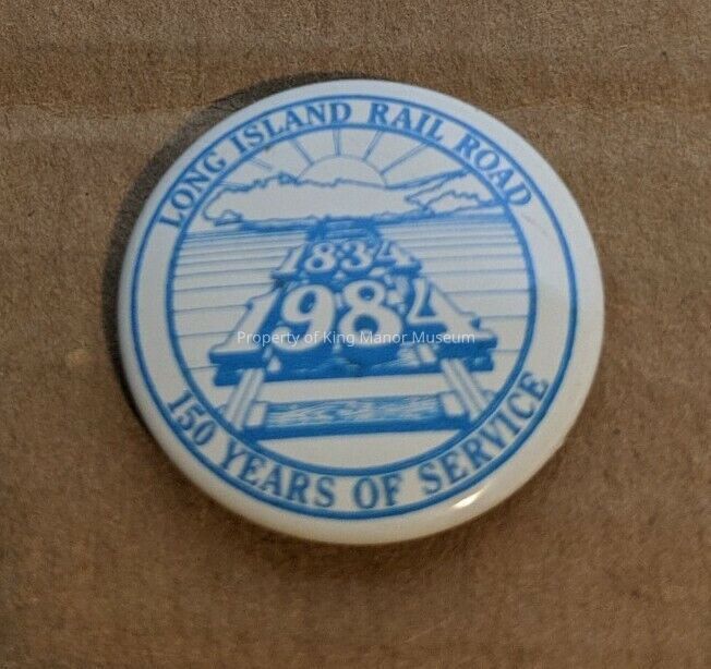 Lapel/hat pin celebrating 150 anniversary of Long Island Railroad 1834-1984. Image rendered in blue with years climbing a train track.