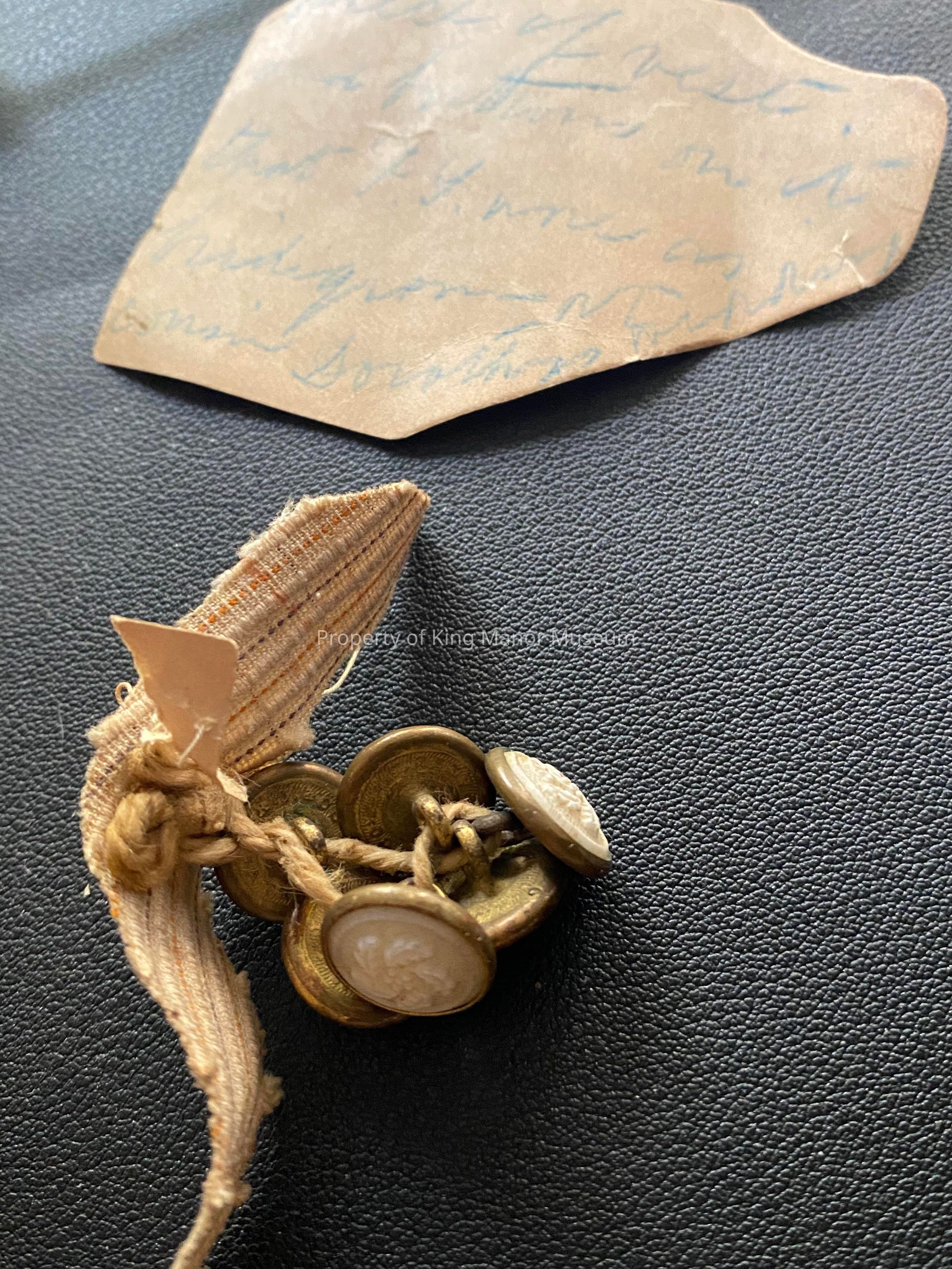 six brass buttons with carved leaf decoration came attached to vest fragment and note that is largley illegible, but might say something about a bridegroom? *found in museum basement chest drawer