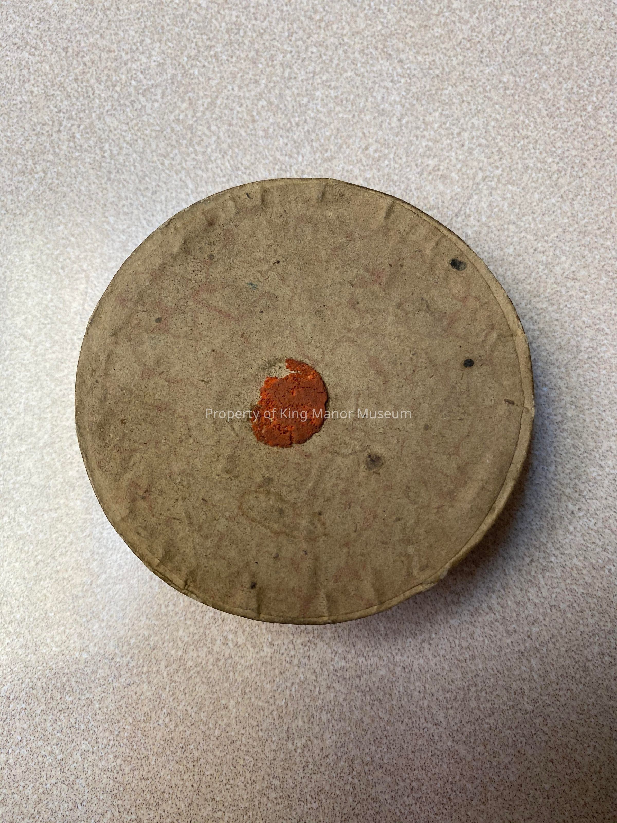 Small circualr container with remenents of wax seal on top. Inside are three metal quill tips *found in museum basement chest drawer