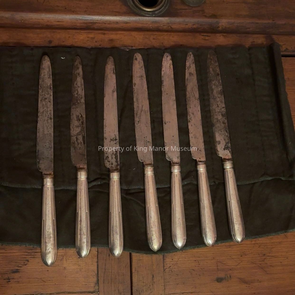 Group of 12 George 111 items, to include: set of 11 table knives, possibly Moses Brent, London, circa 1800, having stirling silver handles wtih thread decoration and engraved crest of Rufus King, a vertically raised animal paw holding a square cross, handles joined to original steel blades, the handles hallmarked, with maker's mark "MB", four handles lacking date letter, blades stamped "Wakelin & Taylor"; together with a sterling silver skewer of typical form, William Ely & William Fearn, London, England, 1801-02, with blade ridged on both sides, engraved with crest as above, fully hallmarked with maker's mark "WE,WF" (point full intact, little wear to the perfectly straight blase) Skewer 13-1/8"l. Approximate weight 3.3. troy oz (skewer only)Provenance