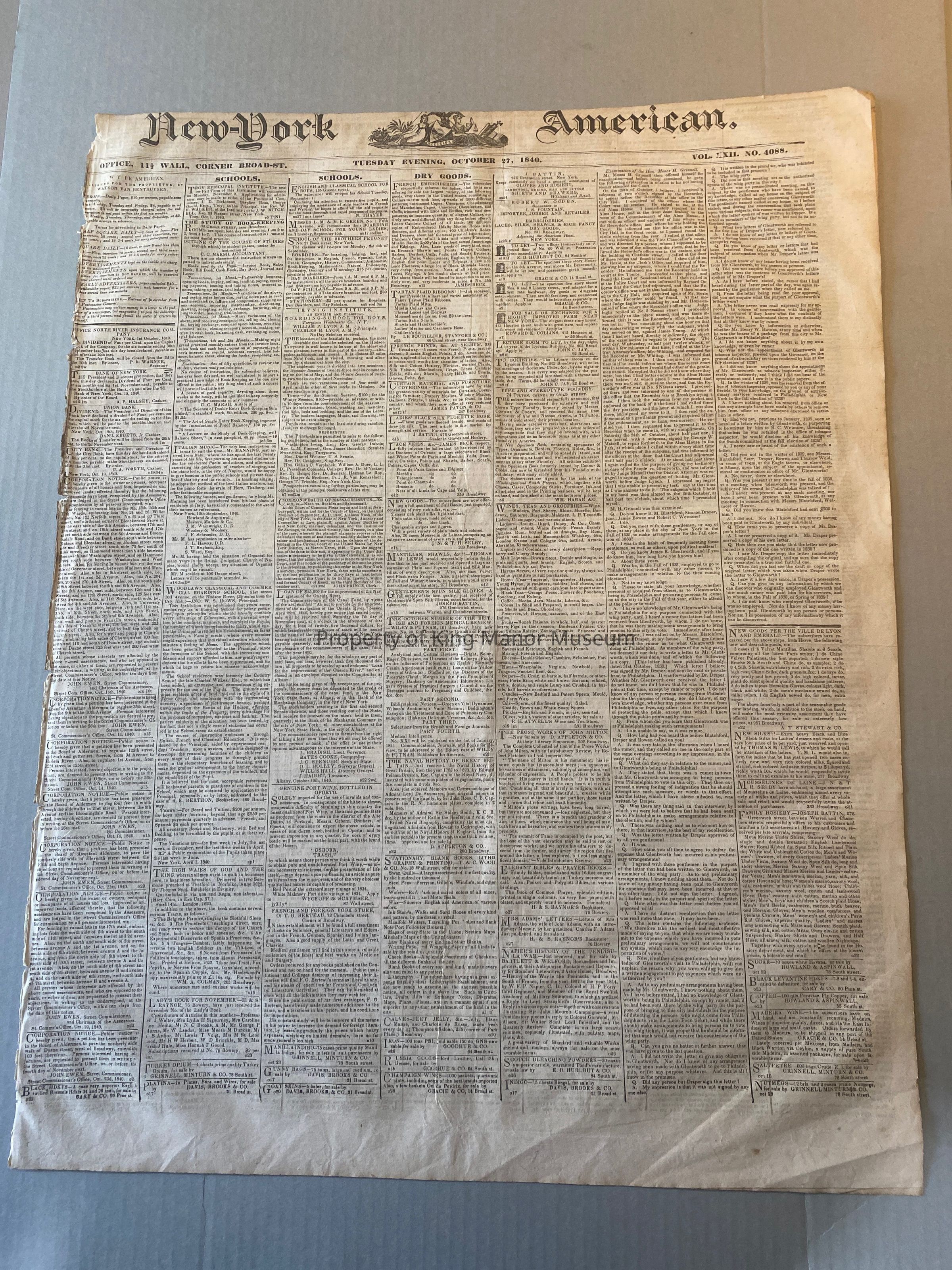 New York American newspaper to be used as prop in Victorian parlor. Charles King was the editor.Collection