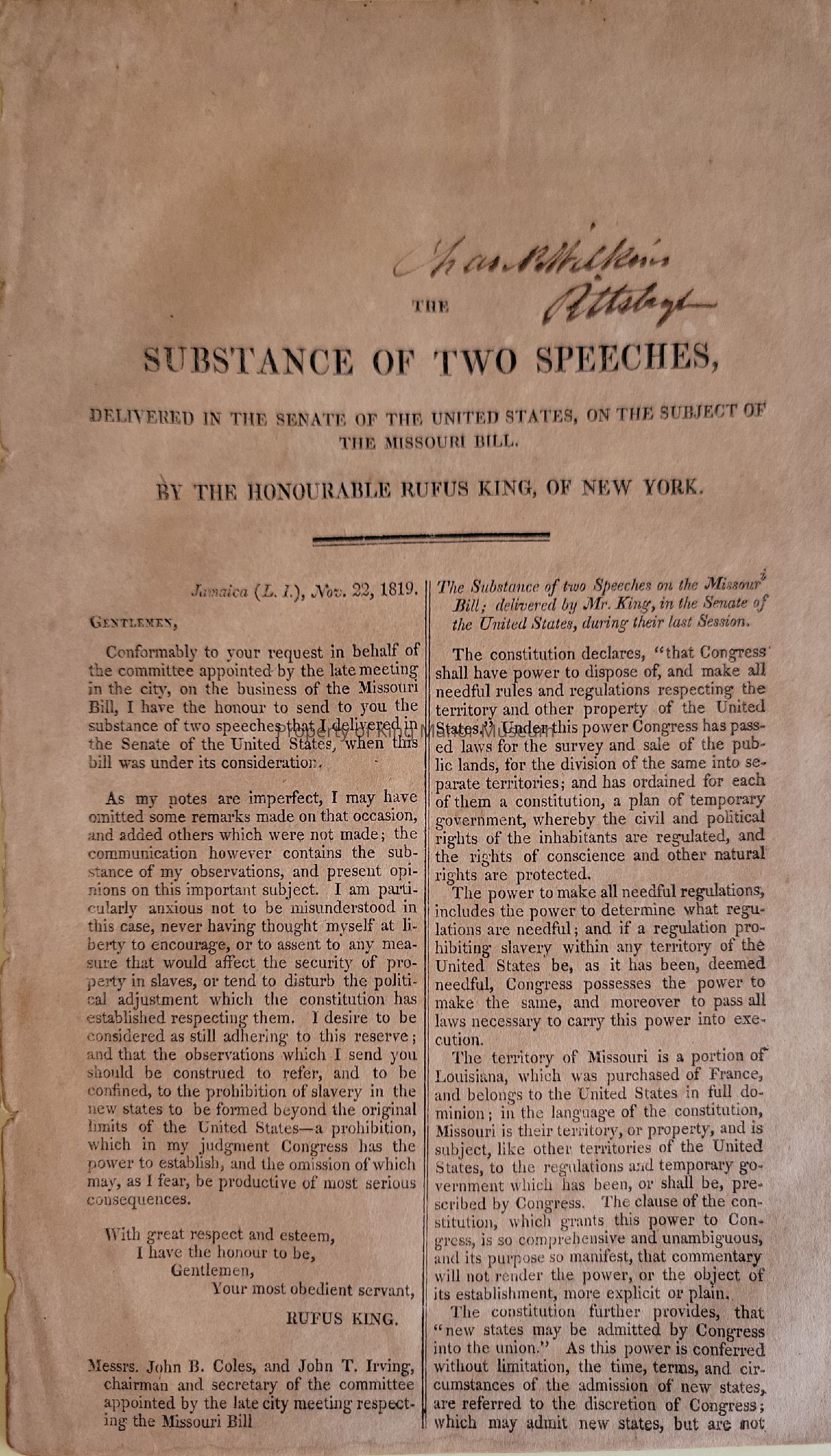 The Substance of Two Speeches, Delivered in the Senate of the United States, on the subject of the Missouri Bill by the honourable Rufus King, of New York.