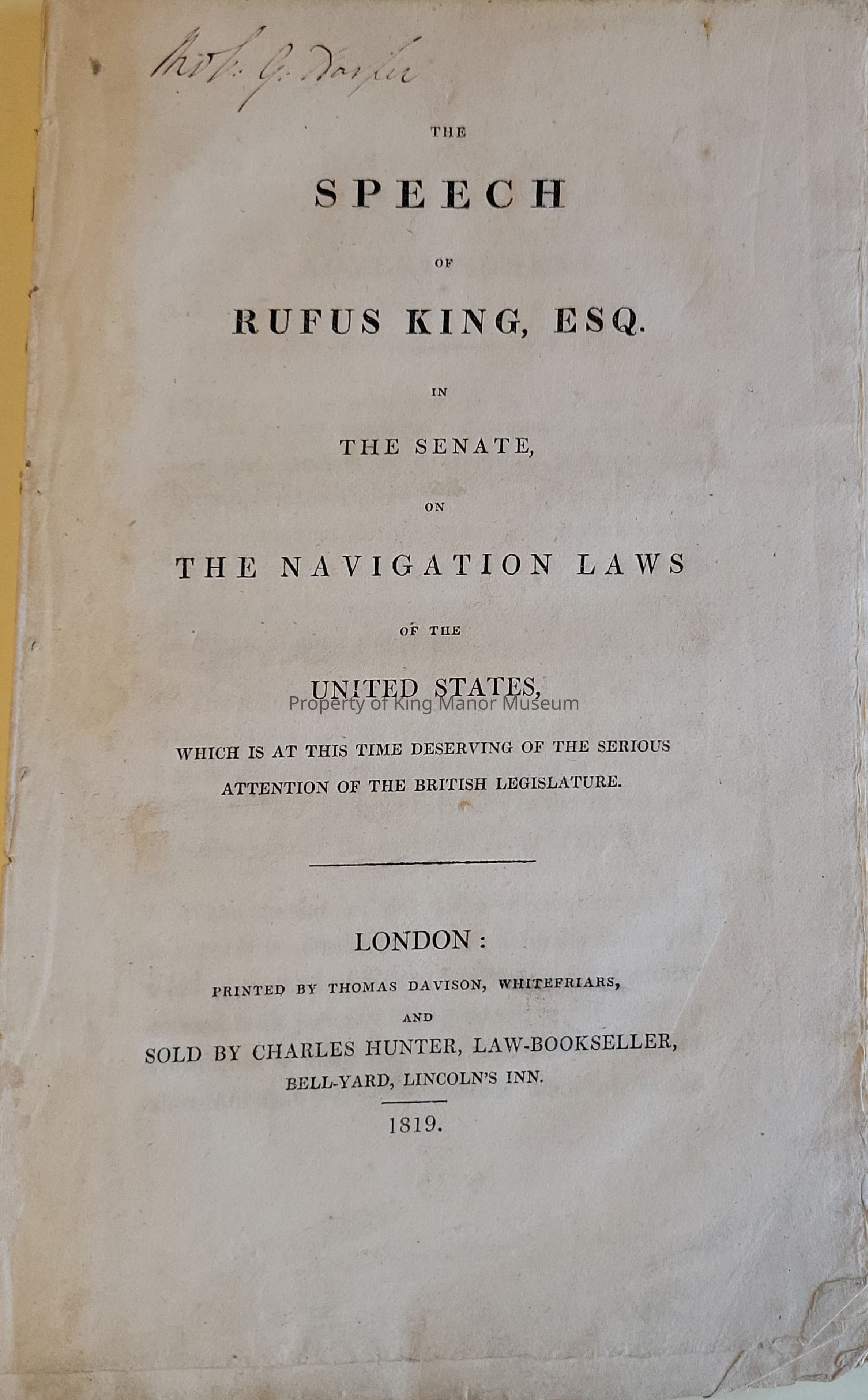 The Speech of Rufus King, Esq. in the Senate, on the Navigation Laws of the United States, Which Is at This Time Deserving of Serious Attention of the British Legislature. 1st U.K. ed., signed by politico Robert G. Harper