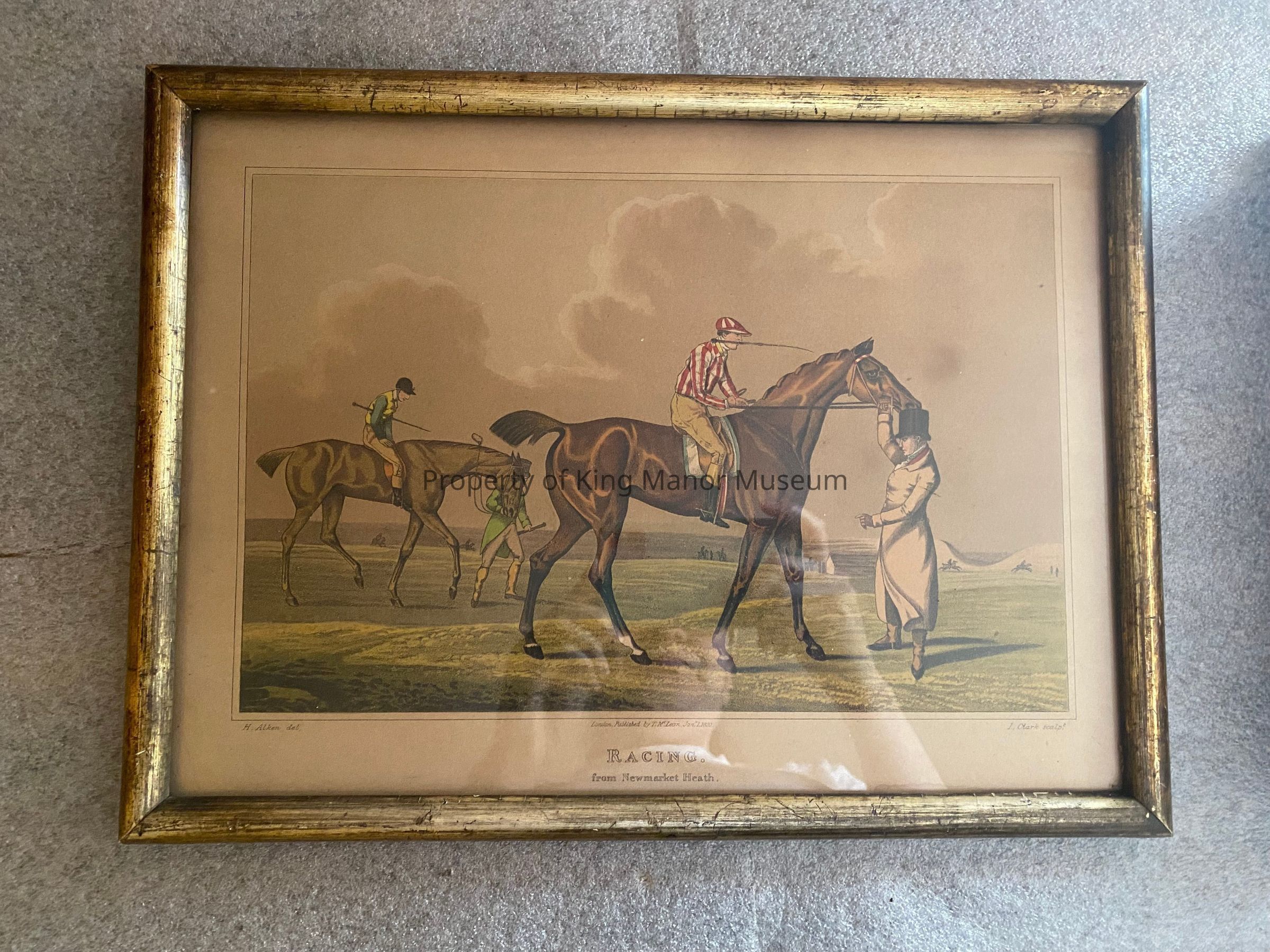 Original aquatint racing print of two jockeys on horses titled "Racing" from Newmarket Heath