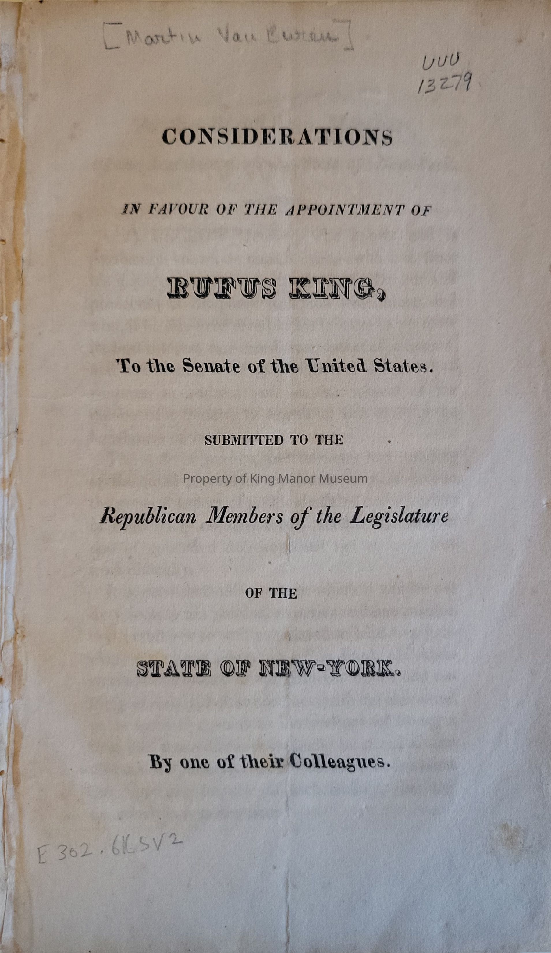 Considerations in favour of the appointment of Rufus King, to the Senate of the United States. Submitted to the Republican Members of the Legislature of the State of New York by one of their colleagues.