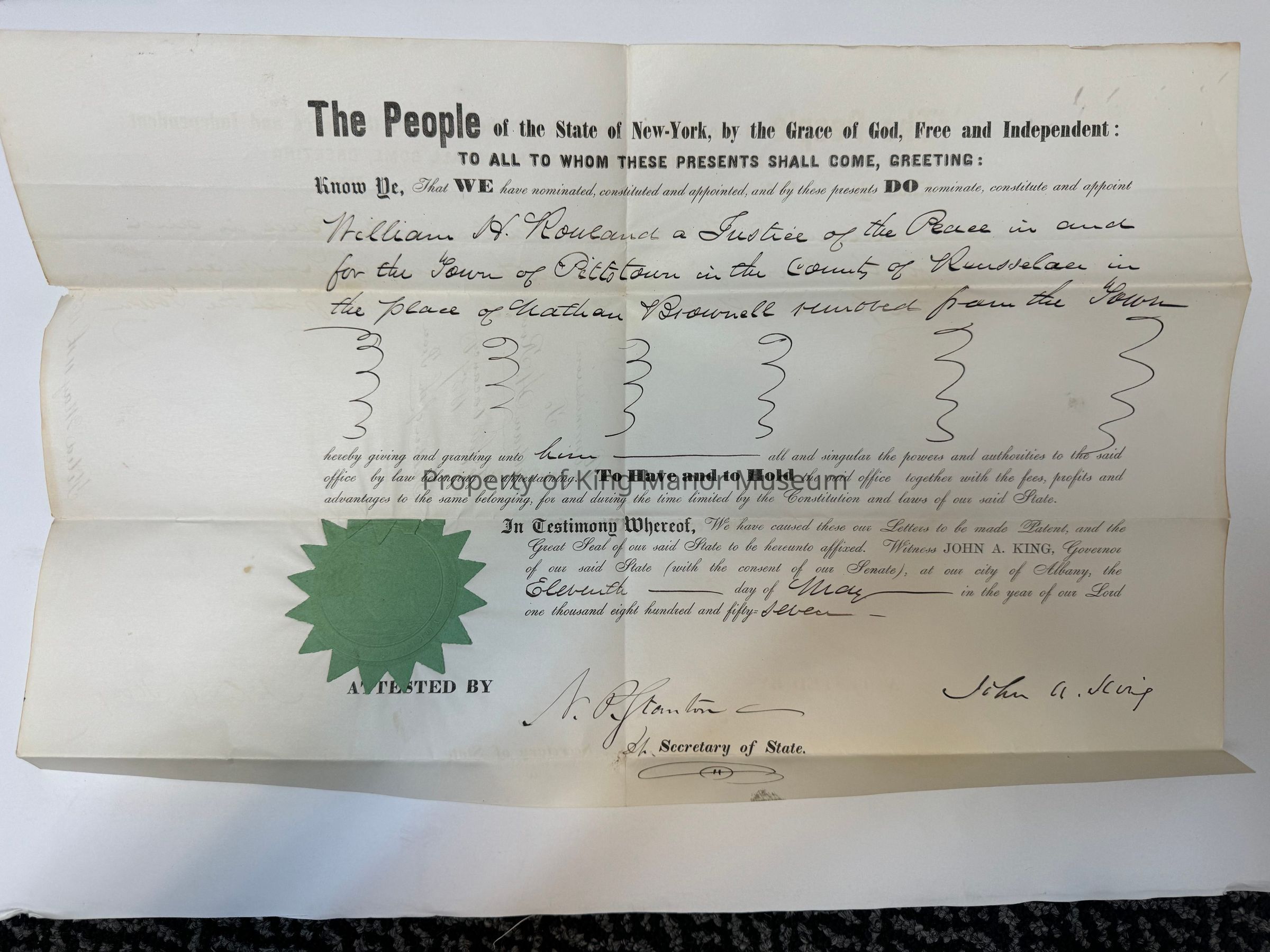 John A, King, Justice of the Peace Appointment. Appointed by William H. Rowland, a Justice of the Peace in and for the "Town of Pittstown in the Court of Rensselaer". Signed by John A. King May 11th, 1857.Collection