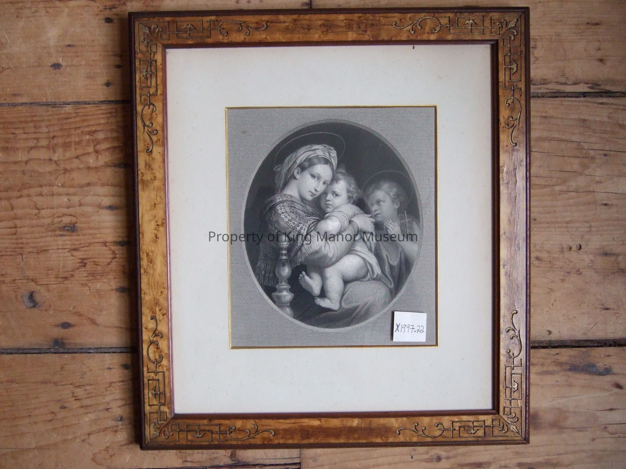 Print: Copy of engraving under glass, of the Madonna, baby Jesus and a young St. John the Baptist. According to hand written label on back, it says that it is a copy of the "Della Leggiola by Raphael, and that it belonged to Rufus King." Cut edge of mat board is colored in gold. Backing paper was removed and placed in file.