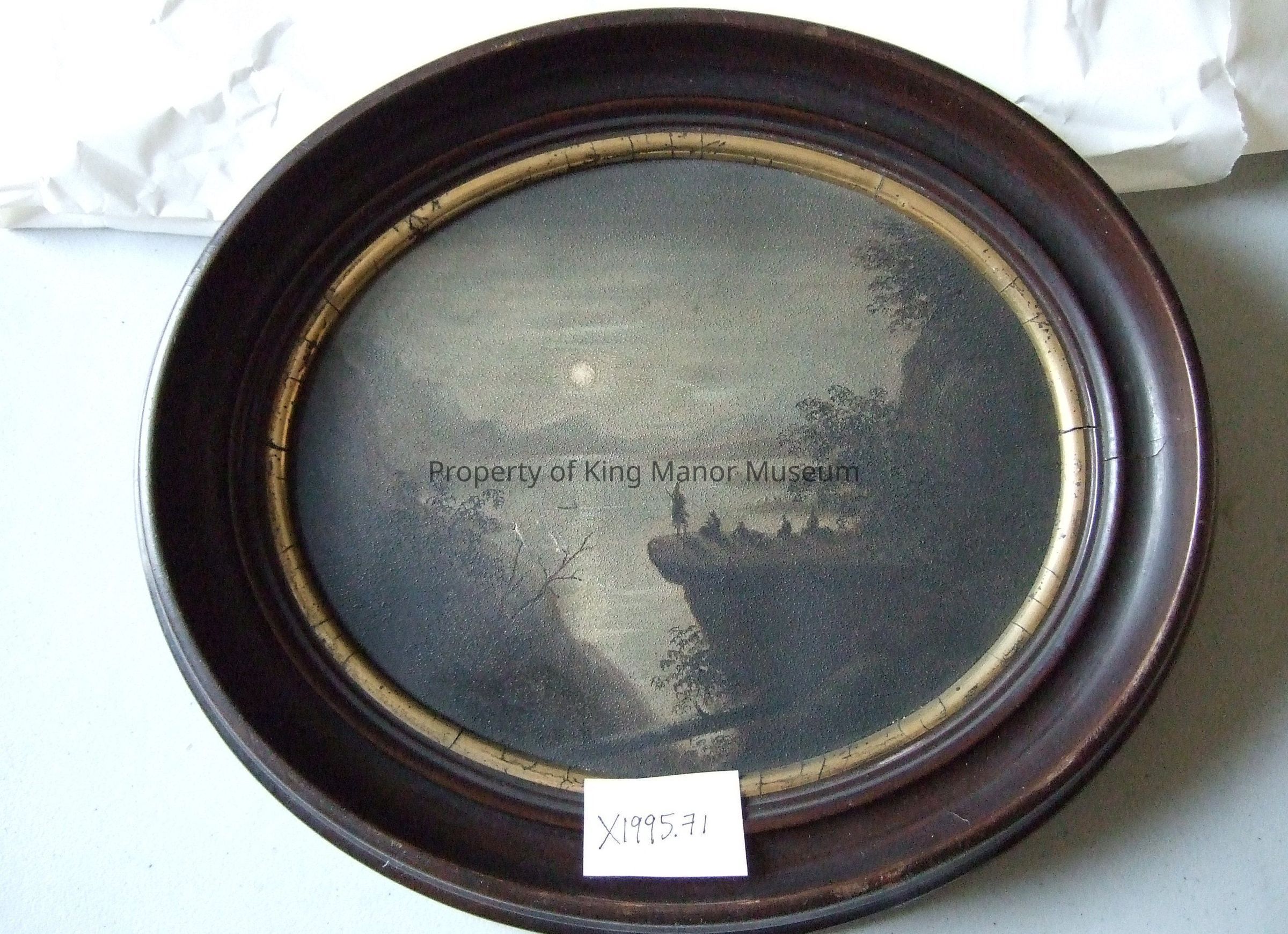 Painting: Oil on paper. Night scene of natural landscape. There is a full moon, five native Americans(?) - 4 seated, 1 standing - on a low cliff, overlooking a river. One person is in a canoe. There are full, leafy trees in the foreground and mountains in the background.