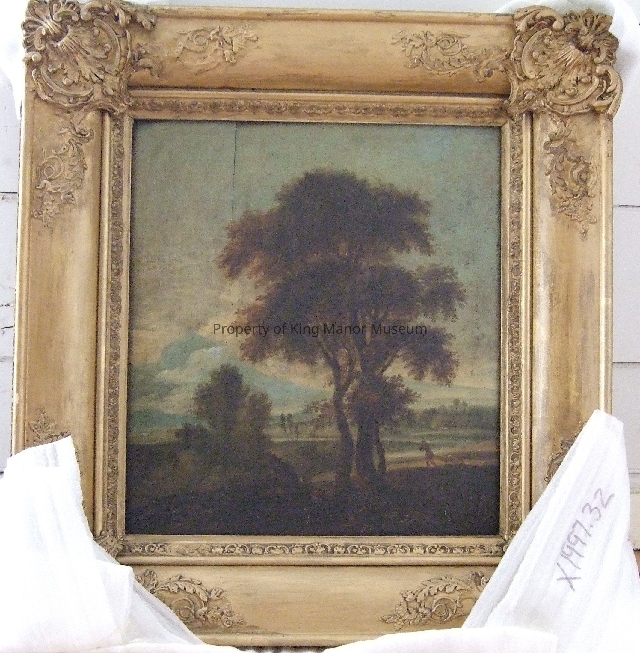 Painting: Oil on wood panel of scenic landscape. Tall tree, broken trunk and smaller tree dominate foreground. There are two figures seated by the fallen trunk and another with two dogs further away. Mountains as well as a lake and trees form the background.
