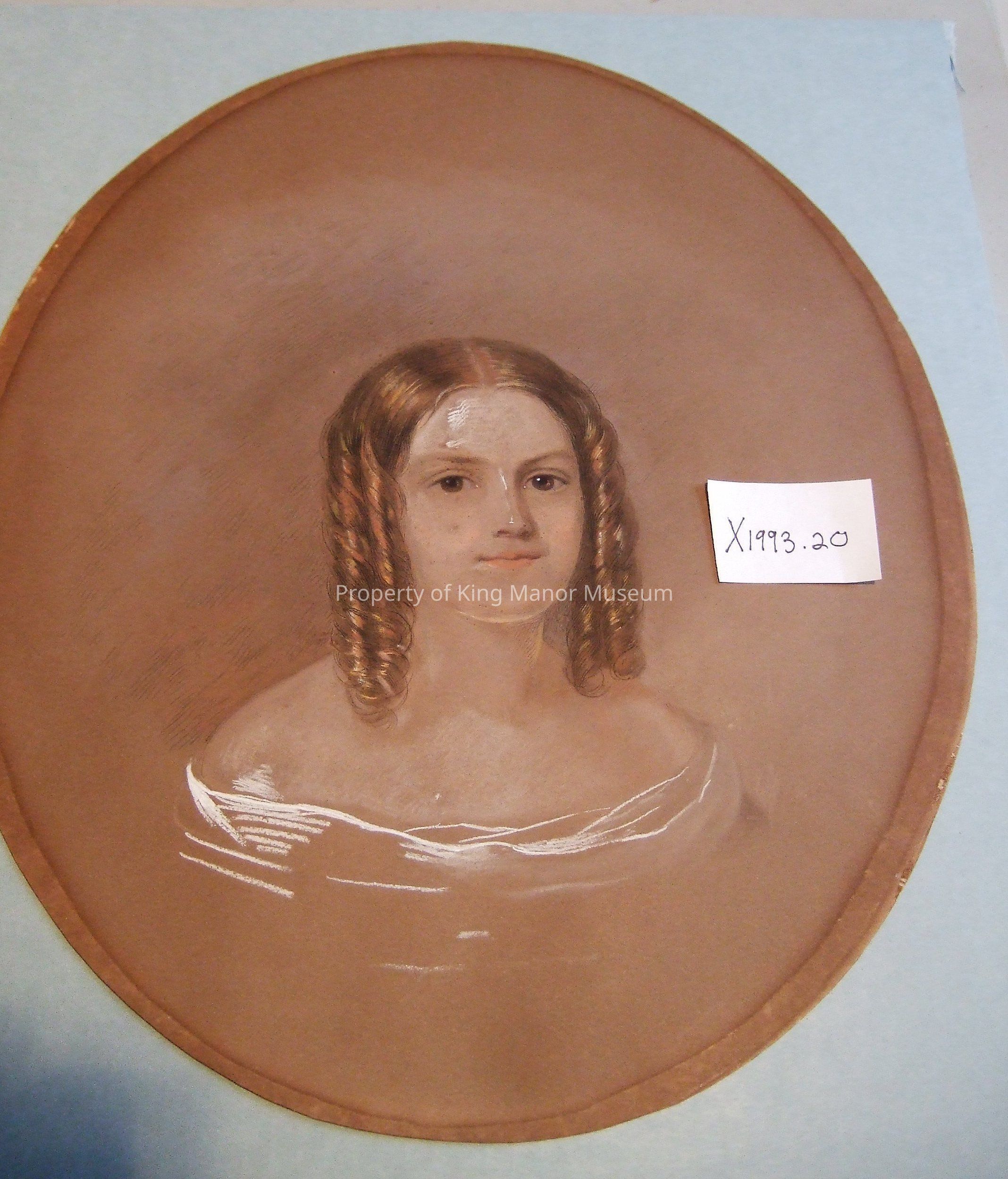 Drawing: Oval, gouache portrait of a young Alice Consett King. Front, bust pose of Miss King wearing an off -the shoulder dress; probably white. Her reddish/blonde hair is parted in the middle and curled at the sides of her face. Her curls reach slightly below her shoulders. (Unframed; removed from frame x1993.020-2).Collection