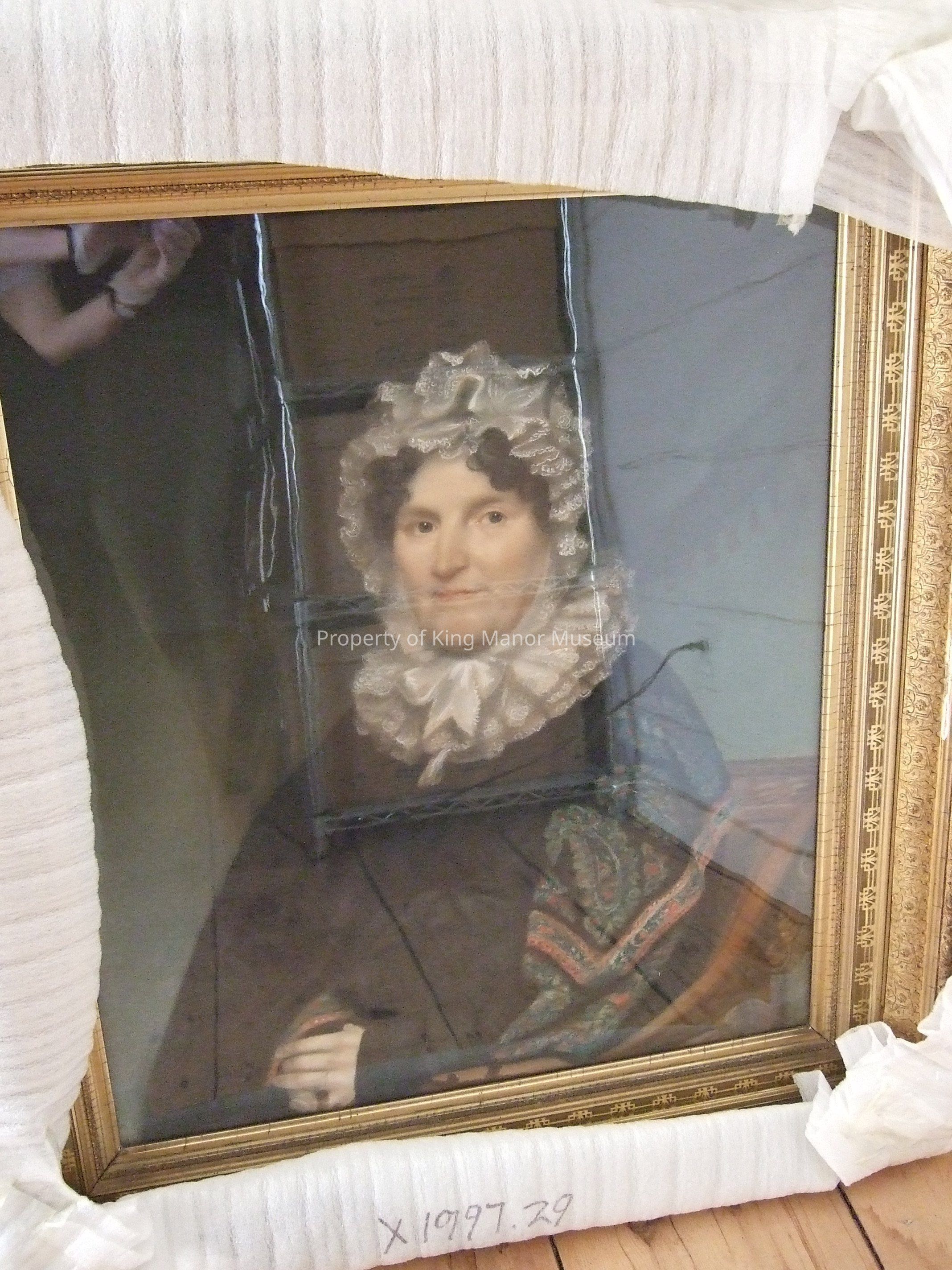 Picture: Large, pastel portrait of Esther Gracie. Front view of Mrs. Gracie seated and behind her is a curtain with tassel/fringe. She is wearing a dark/black empire waist dress tied with a ribbon. Draped around her shoulders is a black paisley shawl. Around her neck is a triple, lace ruff collar. On her head she is wearing a white or blonde lace bonnet. Her hair has been arranged in small, tight curls. The only piece of jewelry she is wearing is her plain, gold wedding band.