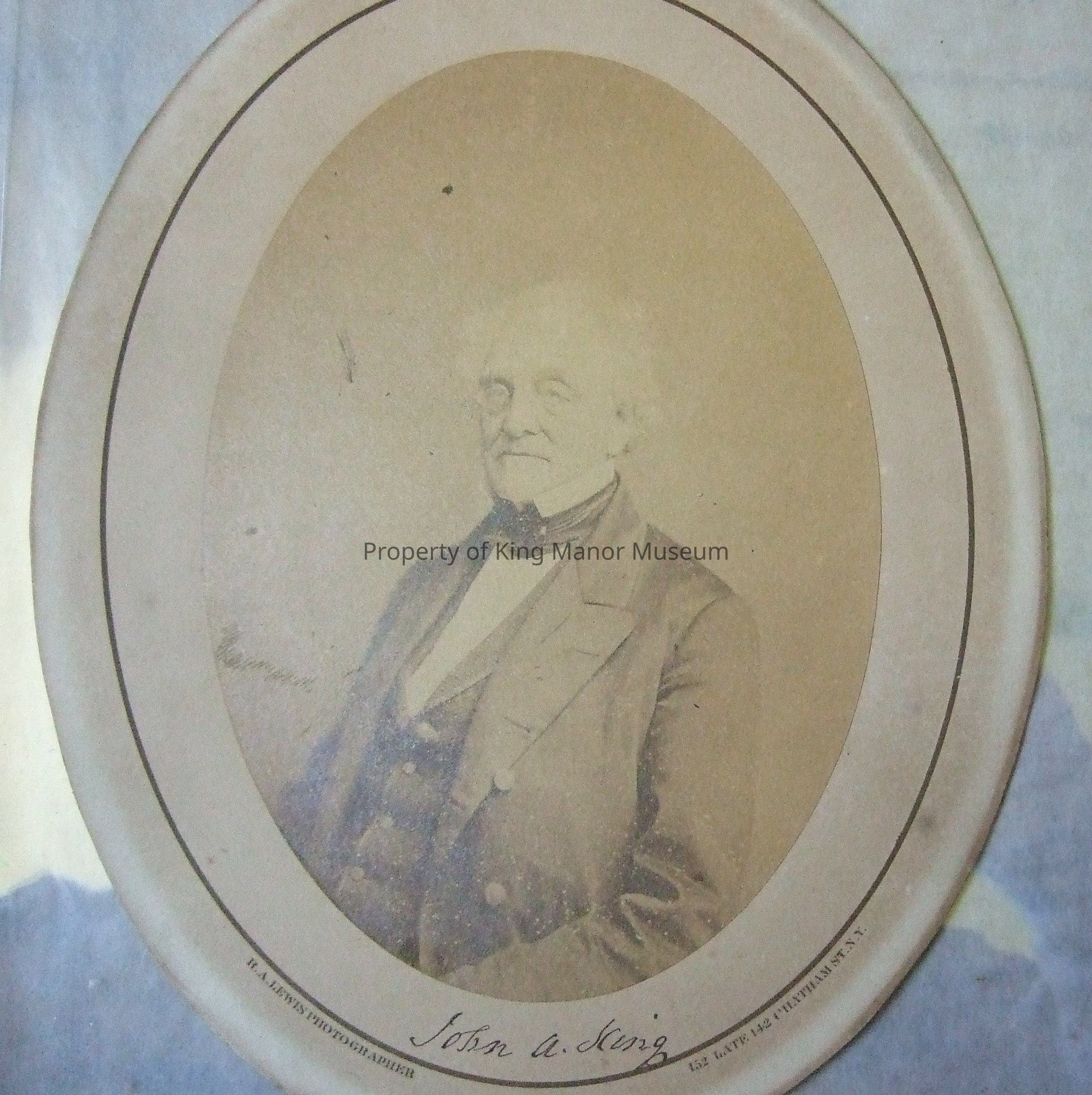 Photograph: Oval, photographic print of John A. King. Portrait with 3/4 view of an elderly John King with white hair and spectacles; he is wearing a white shirt, dark/black coat, vest and cravat.