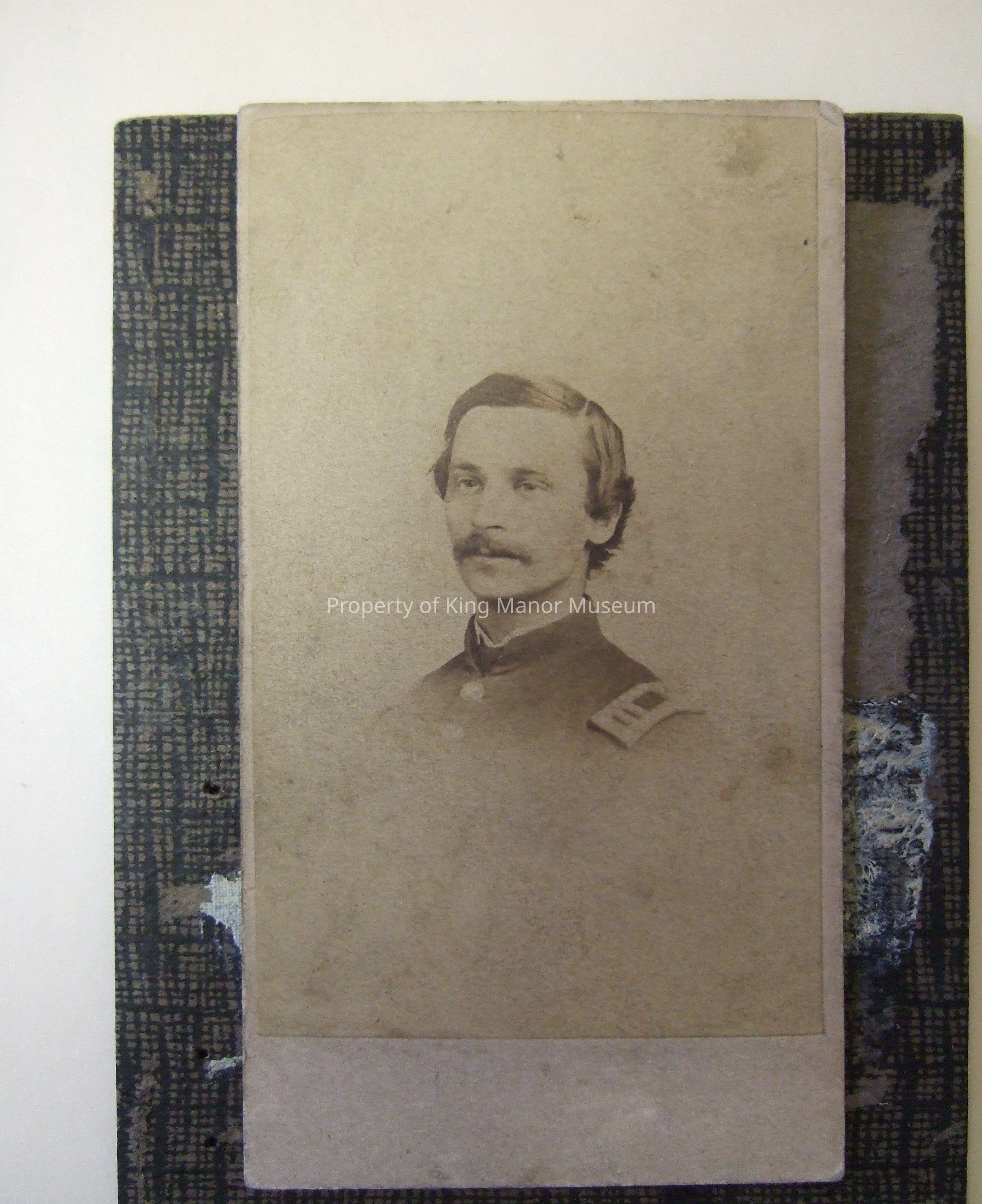 Double, embossed metal frame with photographs, under glass, of Mrs. Eliza Halsey Suydam and Col. Charles Suydam. On the left is Mrs. Suydam wearing an off the shoulder dress. On the right is Mr. Suydam wearing his uniform.