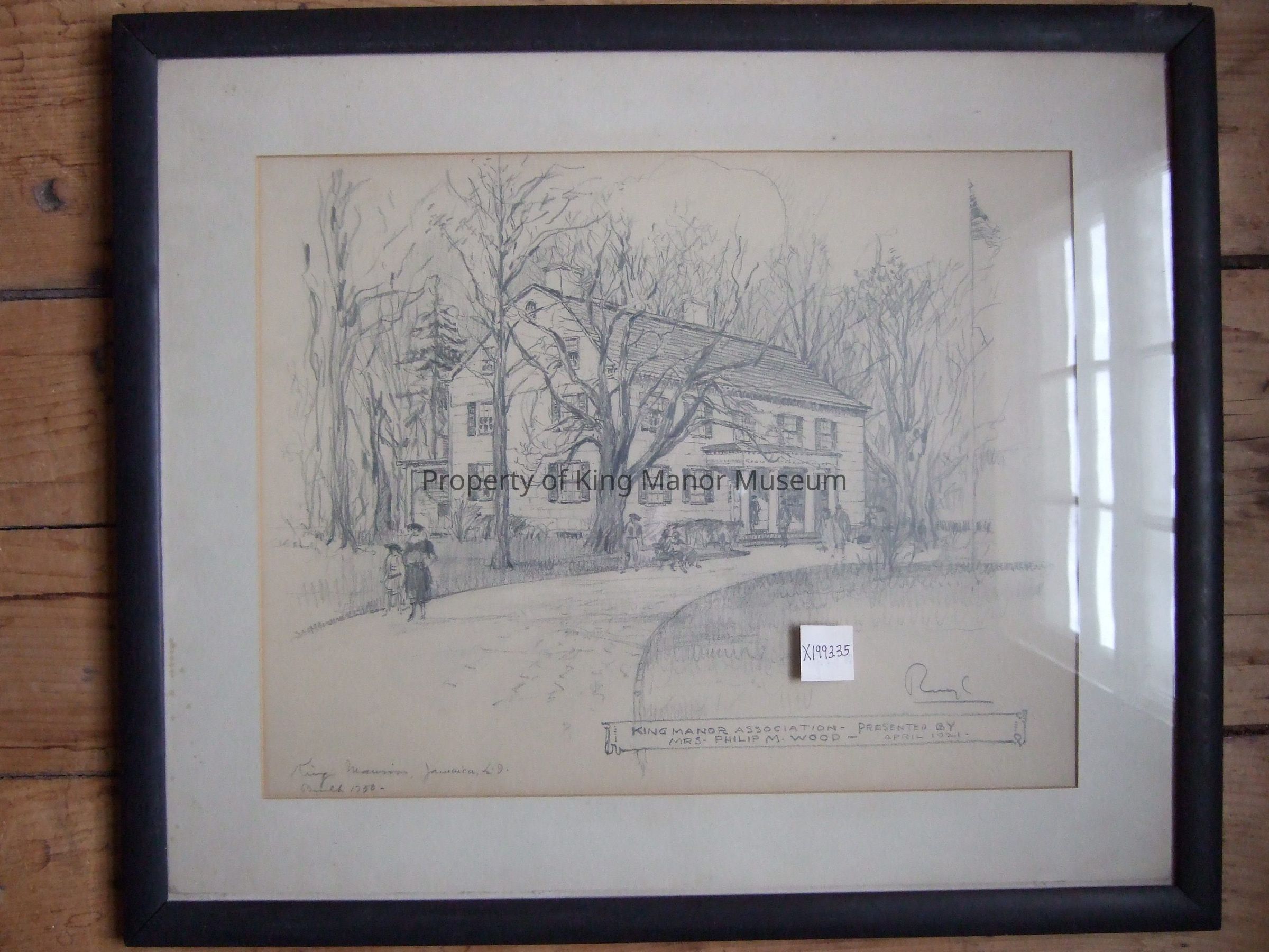 Pencil drawing view from front left of King Manor c. 1921, mounted in black painted frame. Inscriptions, lower left "King Mansion, Jamaica, L.I./Built 1750: lower right "King manor Association. Presented by Mrs. Philip m. Wood, April 1921."