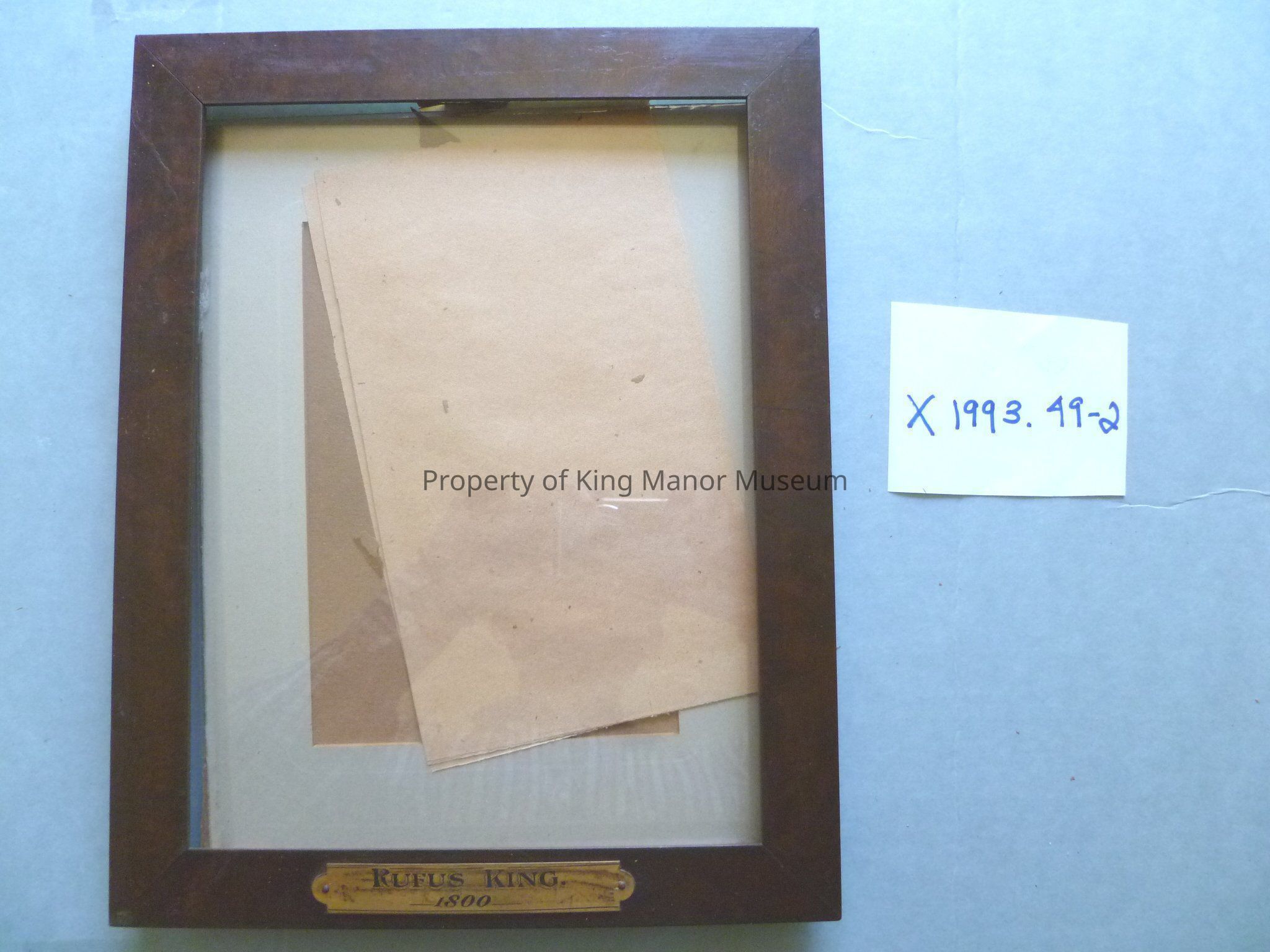 Frame. Wood frame with glass. Burl grain veneer. Brass plate on bottom. Inscription on plate "Rufus King 1800" Frame located in box 75.