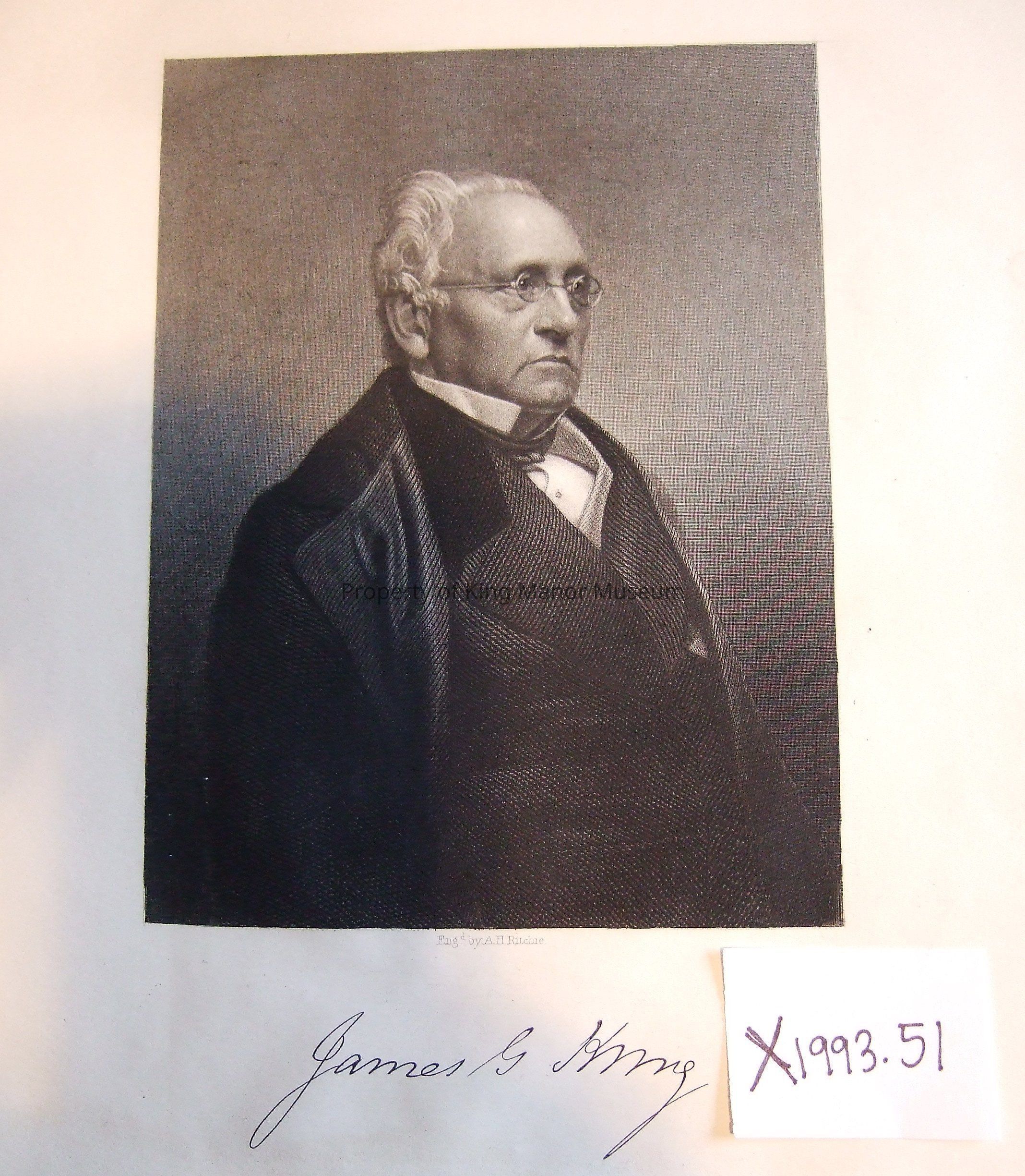 Engraving. Portriat of James Gore King, 3/4 view from waist up. Signed "James G. King" at bottom center. Below signature is written: "Engd by A.H. Ritchie."